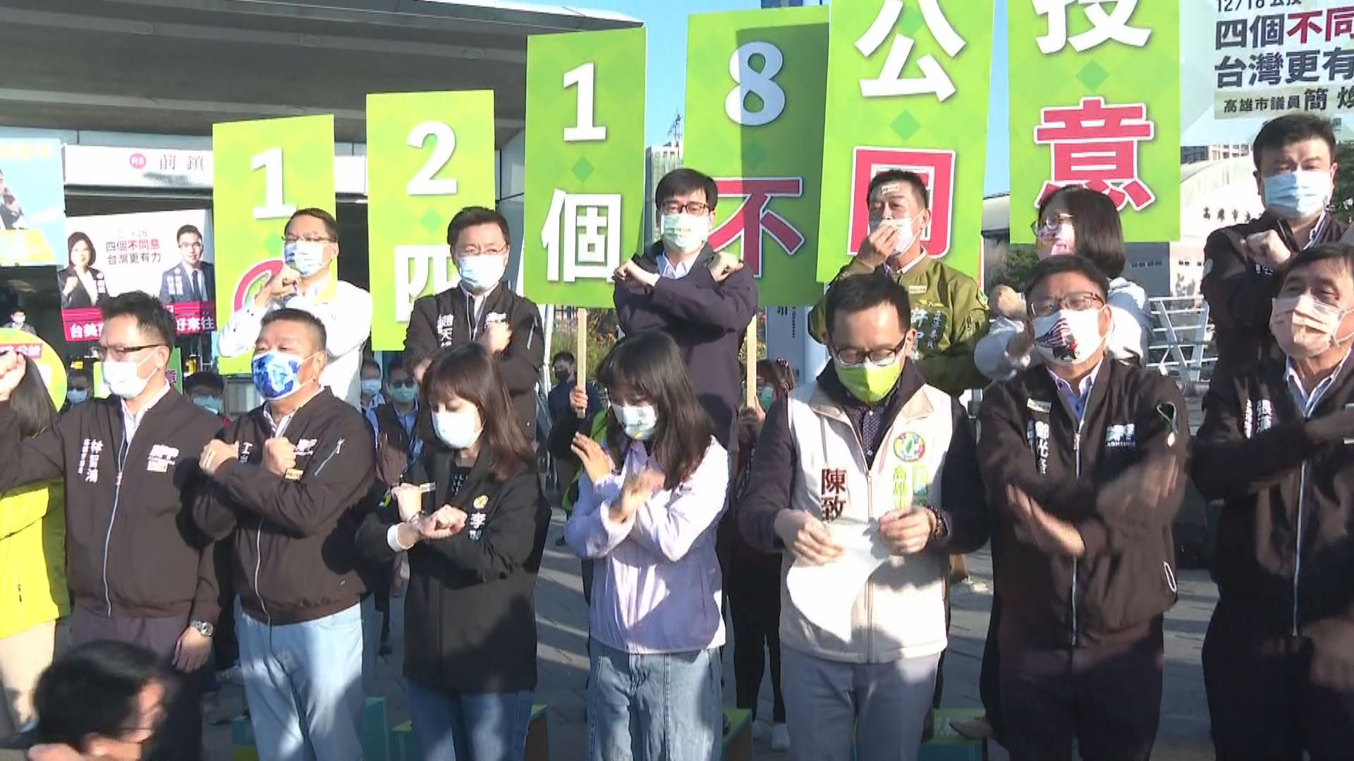 民調有望黃金交叉,總統蔡英文下軍令,要求全體黨公職最後衝刺,基隆、桃園、新竹、嘉義、台南、高雄、屏東,綠營7縣市首長以及在地立委,9日上午通通站上街頭宣講。高雄市長陳其邁:「希望所有的市民朋友,在12月18日投票的時候,可以很冷靜、很理性的來思考,到底我們台灣要何去何從?怎麼樣讓台灣能夠更融合進入整個國際經貿組織?」