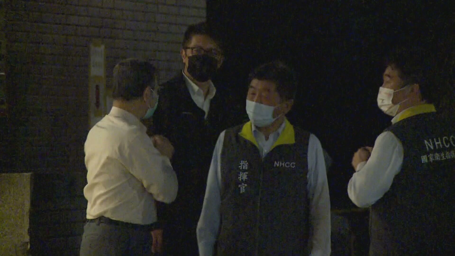 衛福部長陳時中徹夜趕往集中檢疫所坐鎮指揮,身邊還有醫福會執行長王必勝,替匡列者採檢。兩人比肩在集中檢疫所討論開會討論,並且盯著內部監視器掌握檢疫所內的狀況。