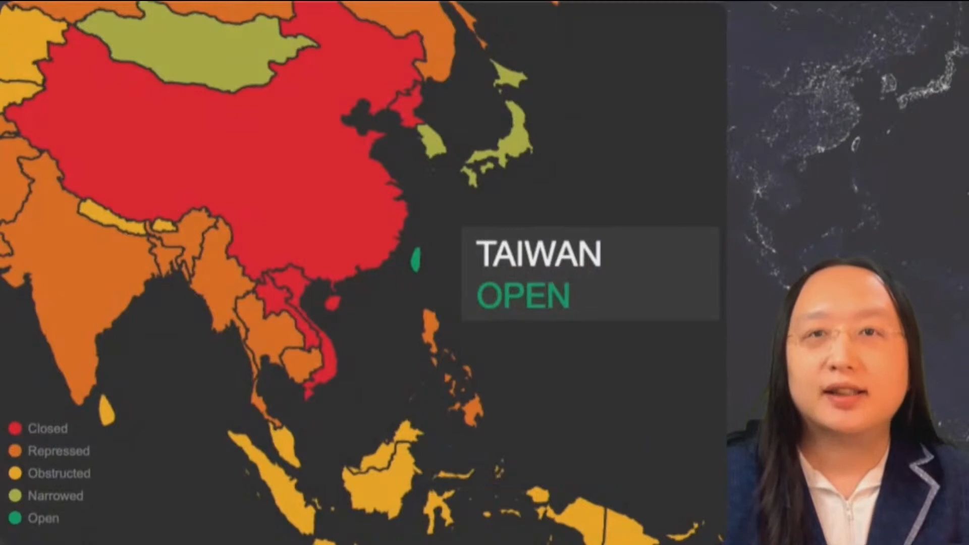 然而《路透社》報導卻指出,唐鳳在10日峰會上所秀出的簡報中,裡頭一張地圖令美國官員大為震驚。這張地圖是由非政府人權組織「公民參與世界聯盟」(CIVICUS)製作,以言論、新聞與集會自由為標準,將全世界各國的公民活動空間分為5種等級,其中台灣被評為最佳等級的「開放」、顯示為綠色,而中國則為「封閉」、顯示為紅色。