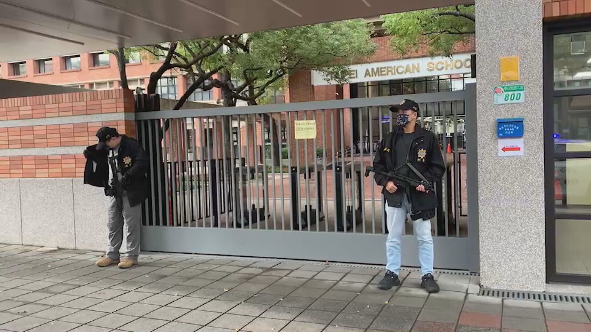 員警手持衝鋒槍站在校門口,隨時緊盯任何風吹草,但上課時間卻沒有任何學生家長出現。原來一天前,位在天母的台北美國學校遭人在網路上恐嚇,13日要到學校開槍掃射。校方接連發現2篇恐嚇貼文,其中一篇出現校內學生的身影,另一則提到種族歧視,還強調13日早上將到美國學校進行攻擊,奉勸自己的好友千萬別到校。