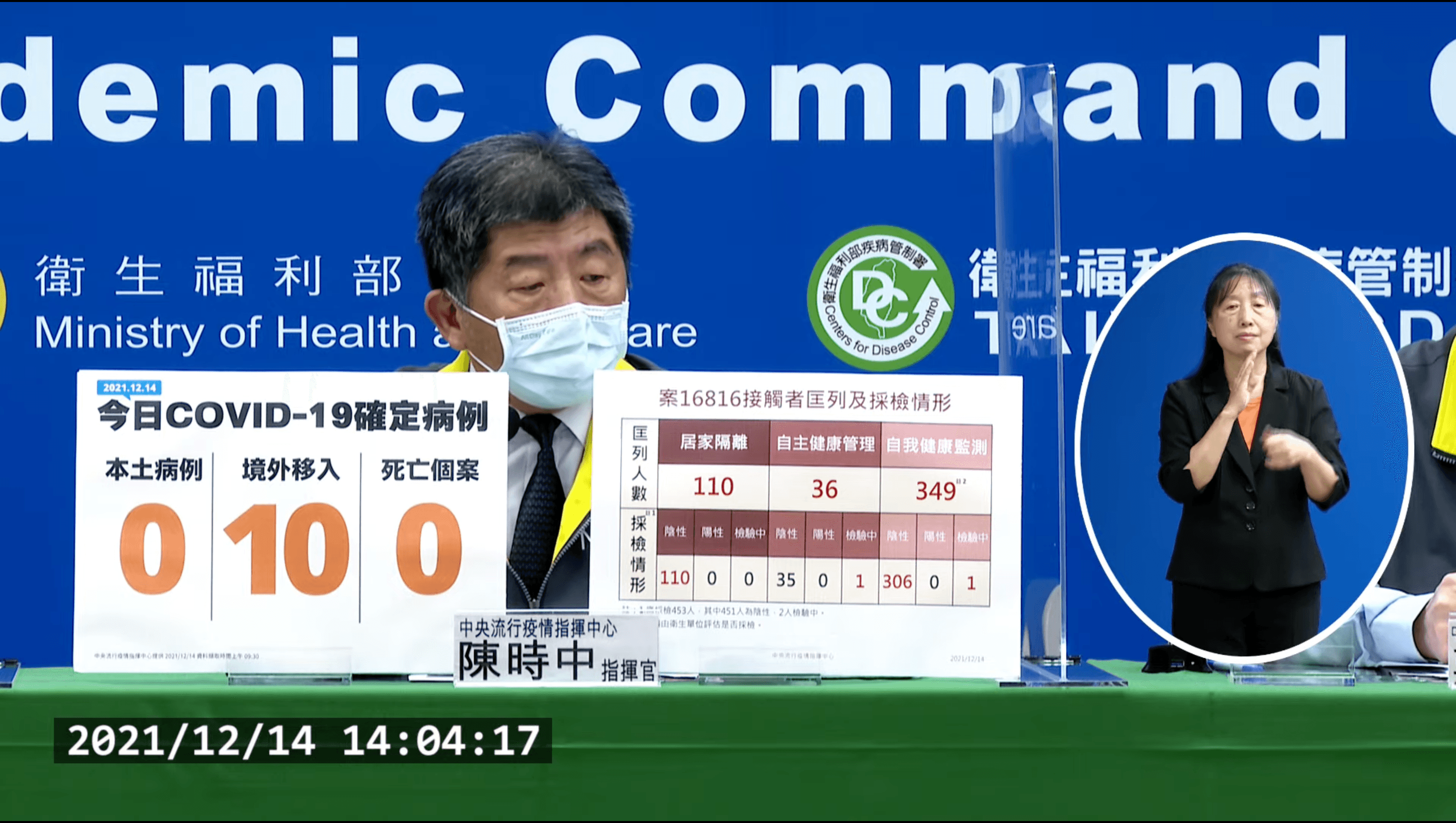 指揮中心說明,14日新增10例境外移入個案,為6例男性、4例女性,年齡介於10多歲至50多歲,分別自美國(2例,案16854、案16855)、香港(案16856)、孟加拉(案16857)、越南(2例,案16858、案16863)、柬埔寨(案16859)、菲律賓(案16860)、阿拉伯聯合大公國(案16861)及印尼(案16862)入境,入境日介於2021年11月26日至12月12日。