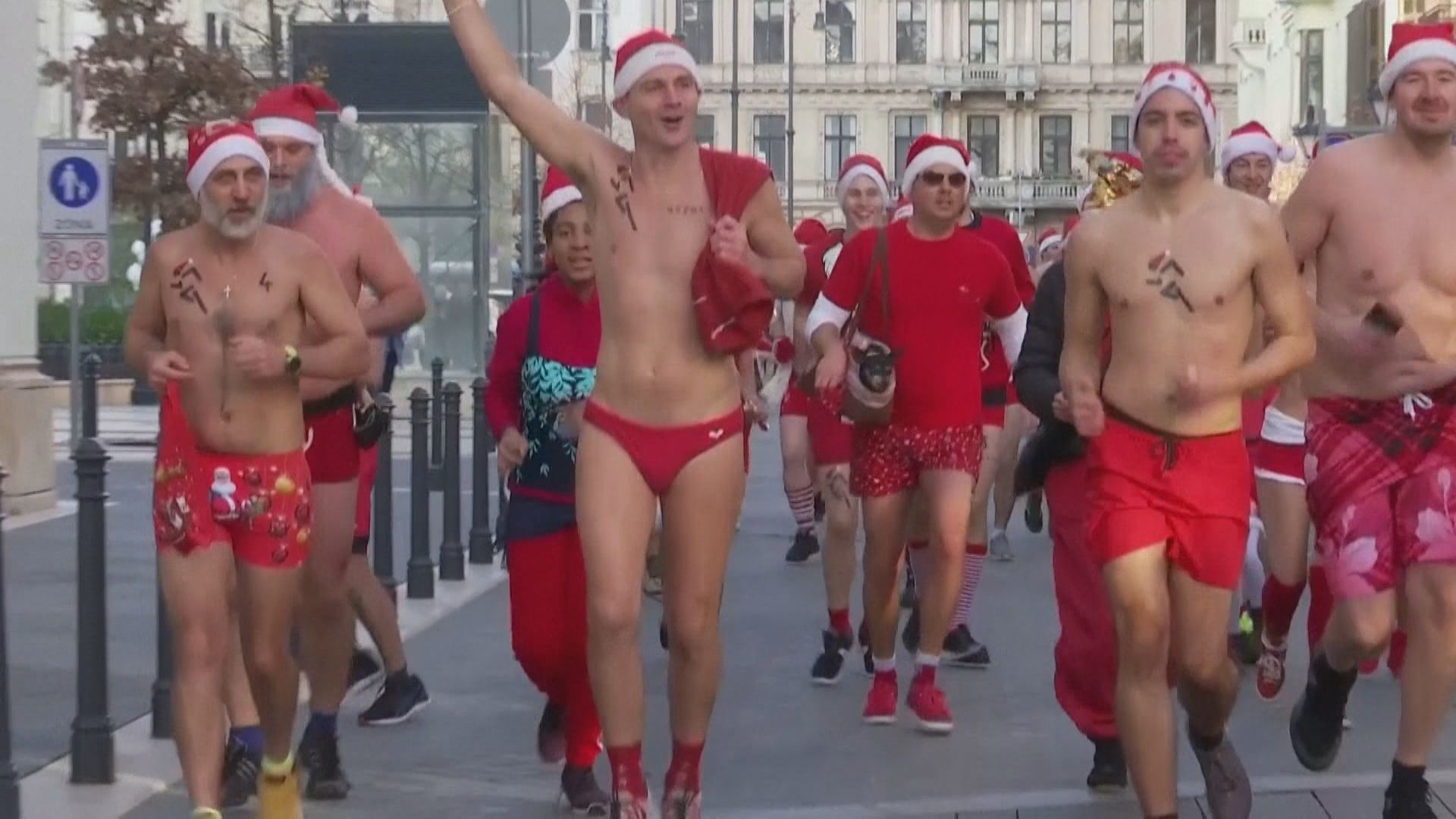 另一頭,匈牙利首都布達佩斯,40多人全身上下只戴著一頂耶誕帽,在逼近0度的低溫下在街道上狂奔。跑過大街小巷,情緒嗨到還一邊唱歌跳舞。