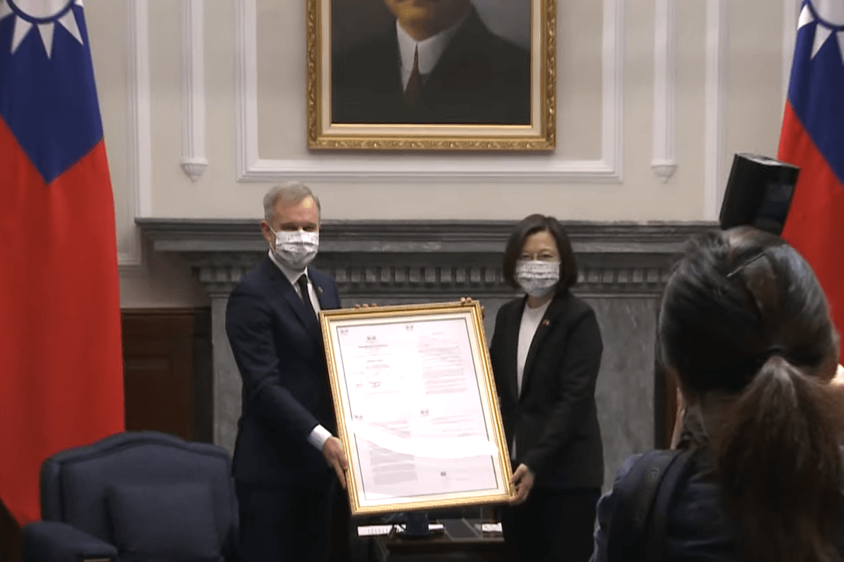 蔡英文最後說,此次訪團都是國民議會外交委員會的成員,面對國際情勢快速變化、威權主義持續擴張,民主夥伴更應該攜手合作,台灣會善盡國際責任,也希望能與法國等理念相近的夥伴,一起為印太地區和平穩定、世界繁榮發展做出更多的貢獻。