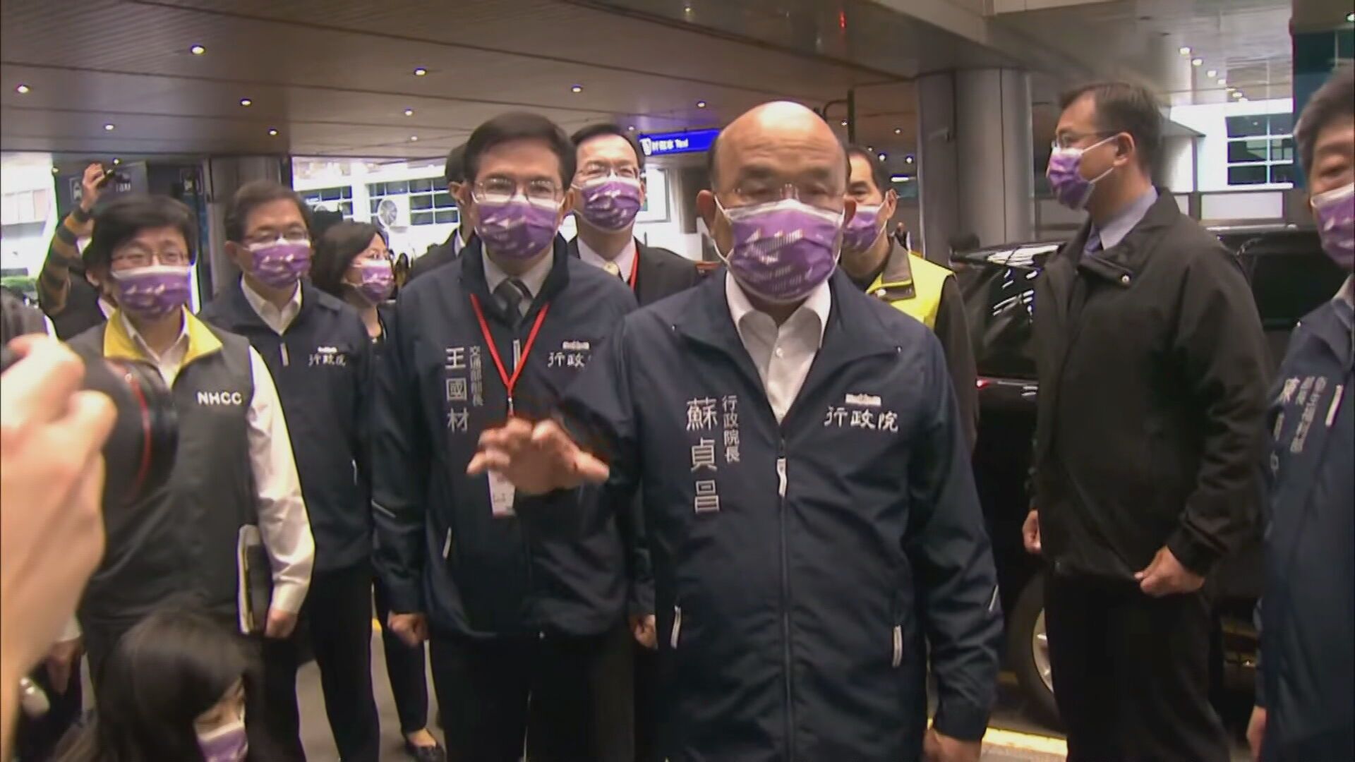 蘇貞昌:「我們也看出相關的準備都已經很充足,動線規劃區隔得很好,那剛剛有最新一班機到,一百多個旅客在一個小時都已經坐上防疫計程車了。」