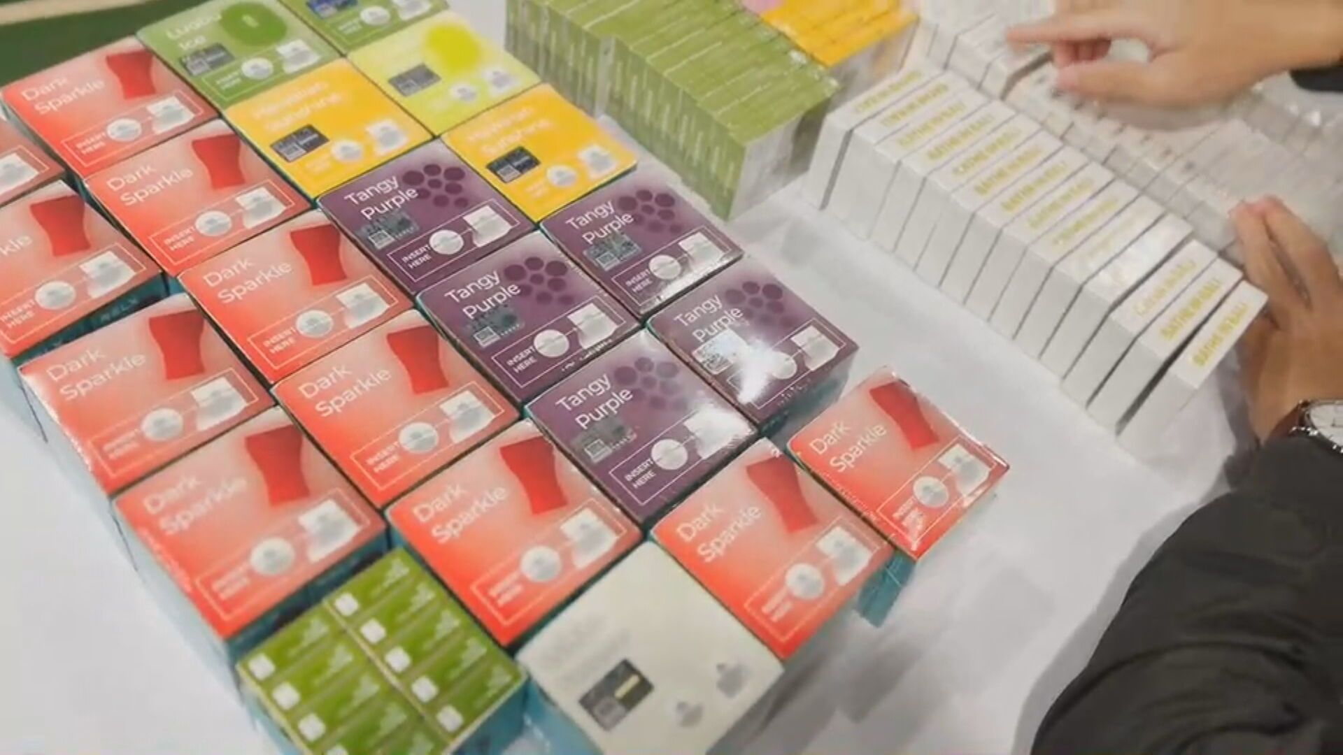 警方執行搜索,看到鐵架上貼著五顏六色的標籤,這些全是非法走私入境的電子菸油。電子菸油放箱子,把一盒盒菸油帶回偵辦,警方還在屋內查獲帳冊,原來許姓嫌犯向中國批發大量A貨,再透過群發簡訊亂槍打鳥尋找買家。