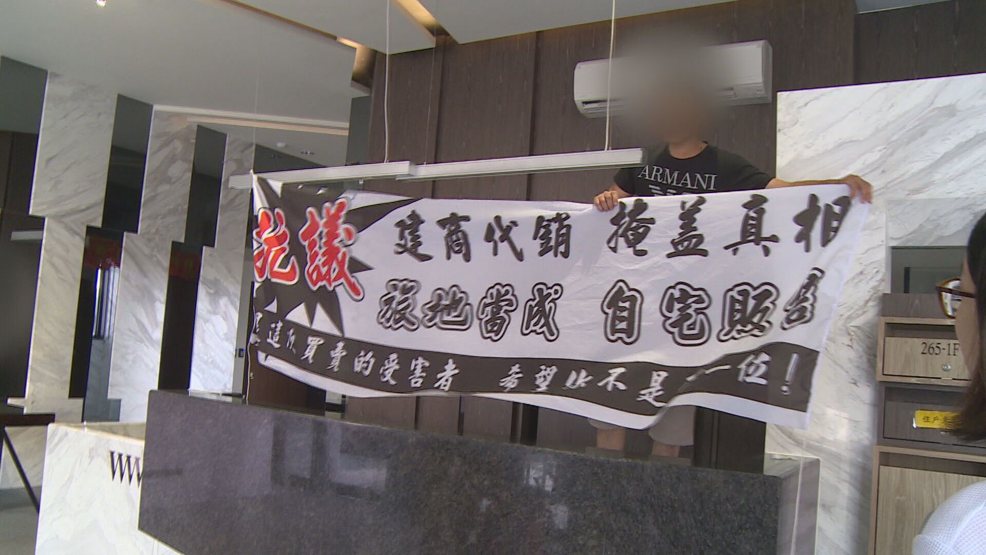 在建案門口,拉起白布條抗議,因為誤入買房陷阱,看似嶄新社區,其實是旅館用地,根本不能當住宅使用。