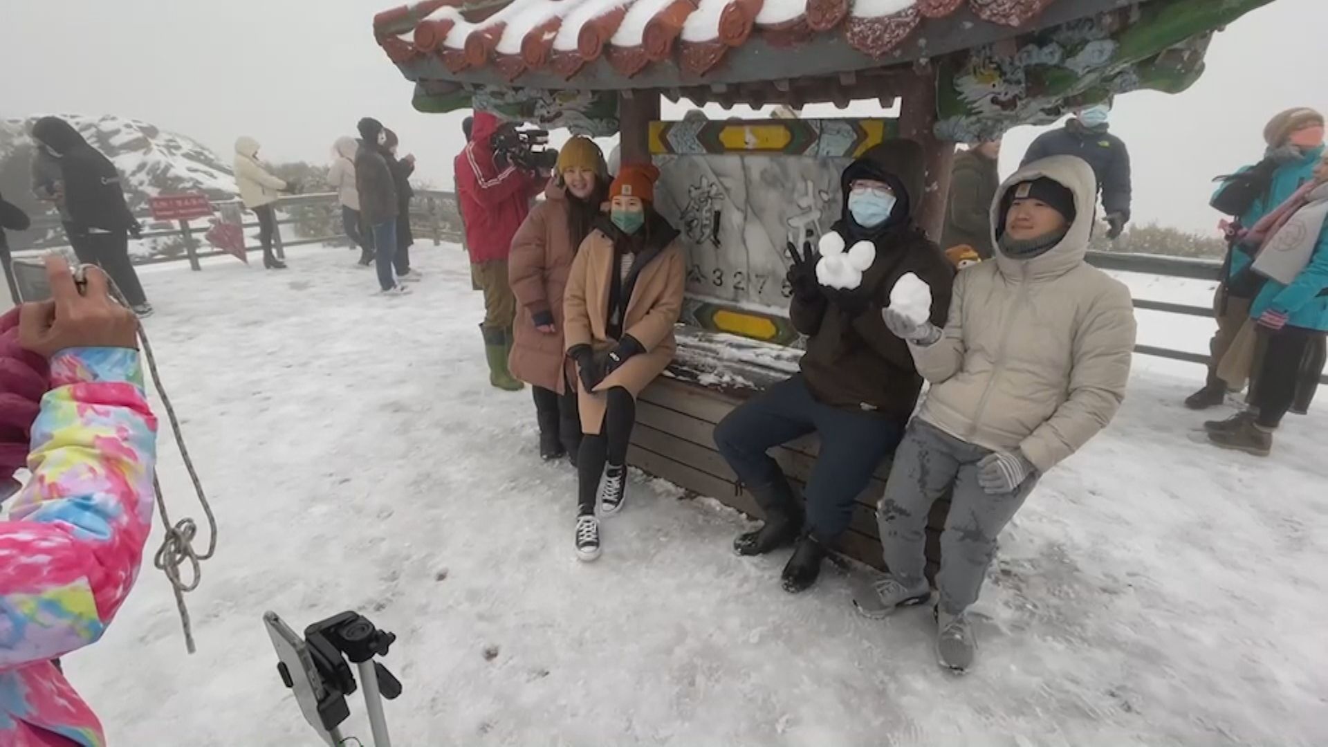 緊接在合歡山之後,玉山也在凌晨3點15分降下今年第一場雪,中間雖然停了一下,但清晨5點20分到9點半又降下下皚皚白雪,積雪高度高達2公分。玉管處人員:「我們山莊到玉山主峰全部都是在飄雪,現在一直在飄雪,而且你們全部都到這邊就好了,在附近(拍照)拍一拍就好了。」