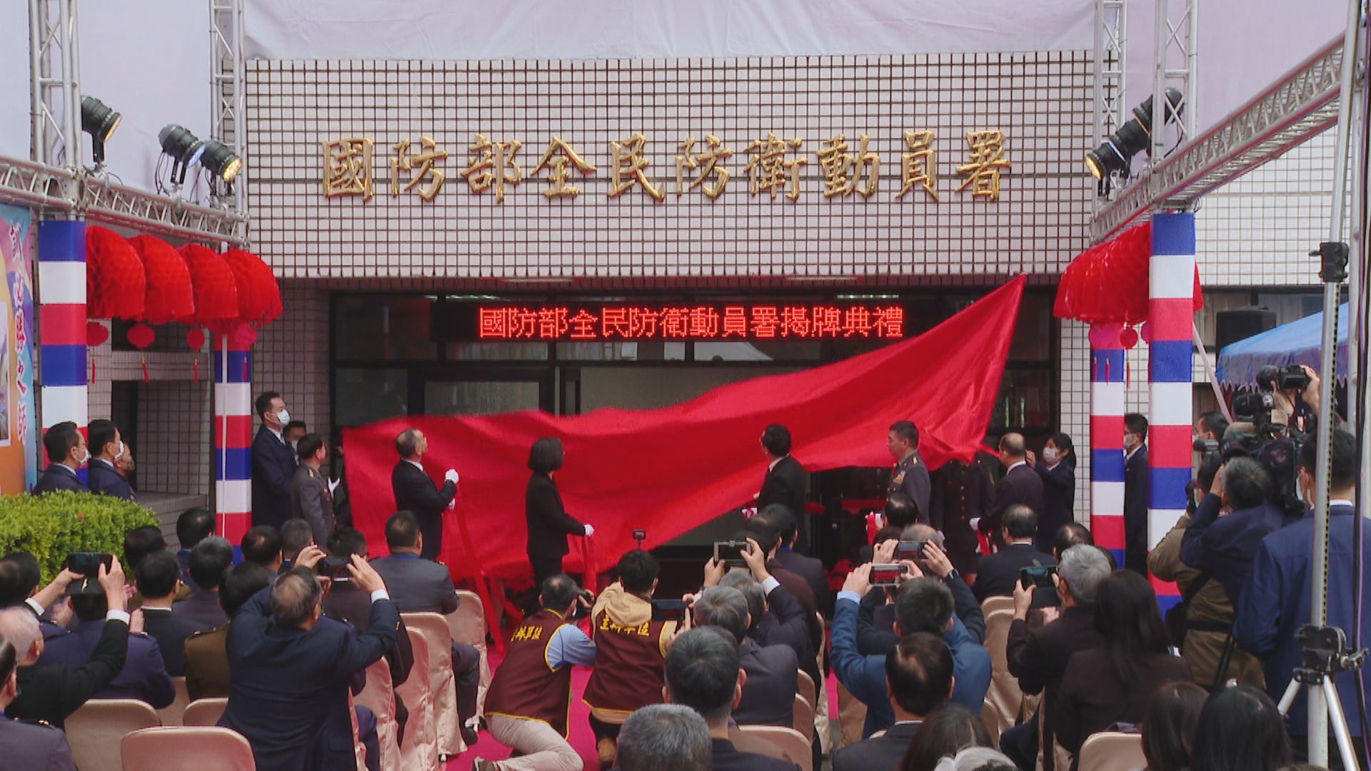 紅色布幔落下,國防部新機構「全民防衛動員署」,在眾人見證之下完成揭牌,肩負建軍重任,總統給予高度期許。