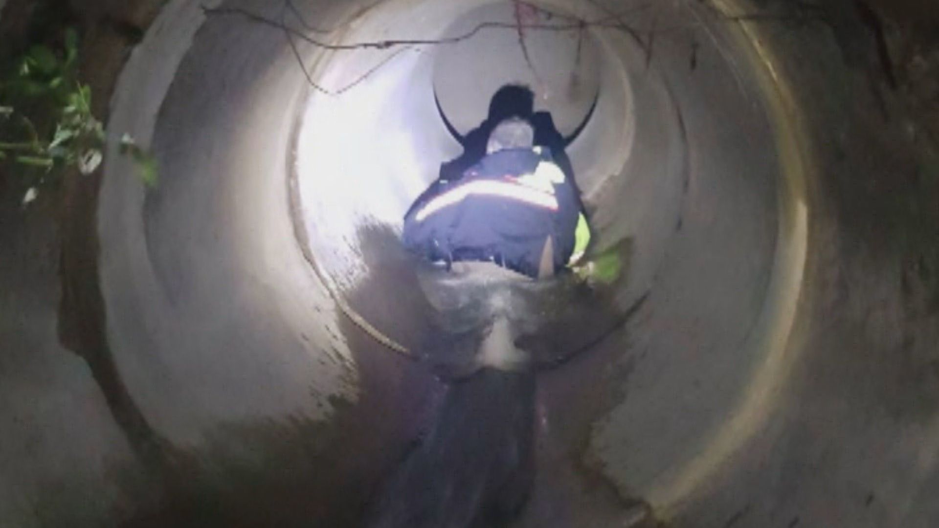 對著涵洞呼喊確認婦人狀況,入夜後氣溫低,貼心的波麗士大人把外套脫下來,給她當棉被。員警vs.消防人員:「她已經泡一天的水了,(她從幾點泡到現在?)應該從昨天下午4點就掉下來了。」