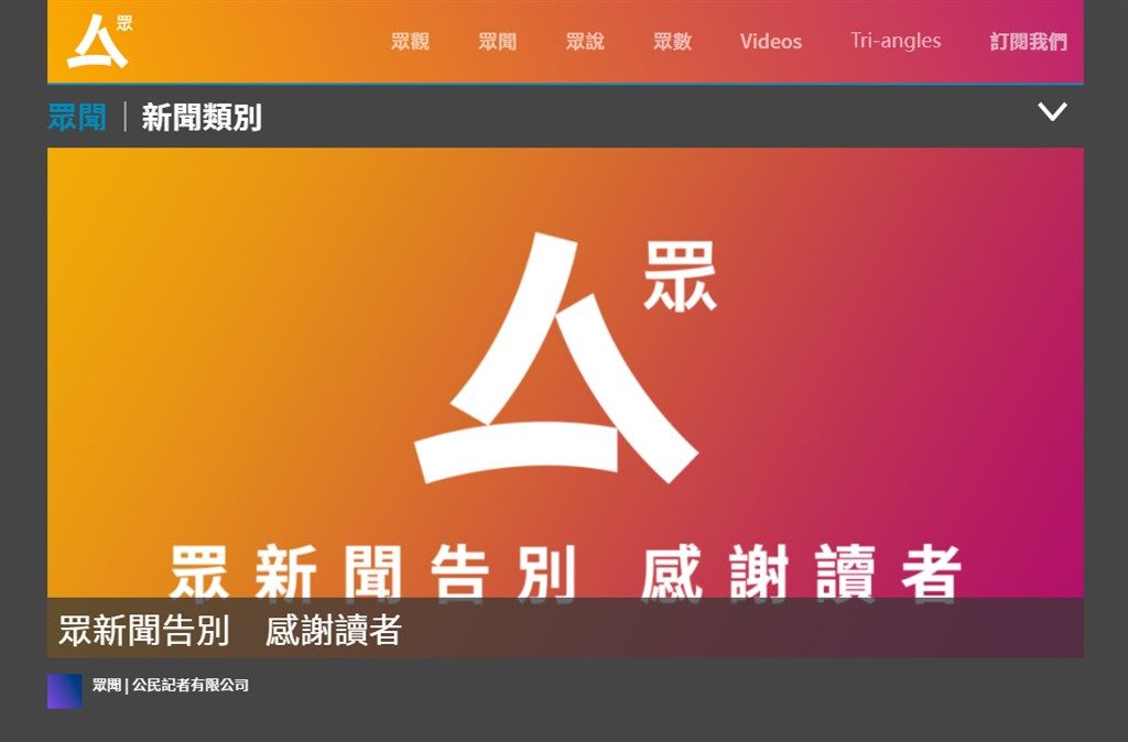 《眾新聞》2日晚間預告,將在4日停運並遣散40多名員工,其網站已沒有更新資料,只有《眾新聞》的公司標誌,上面寫上「告別感謝讀者」字句,以及團隊成員們寫下的告別信。