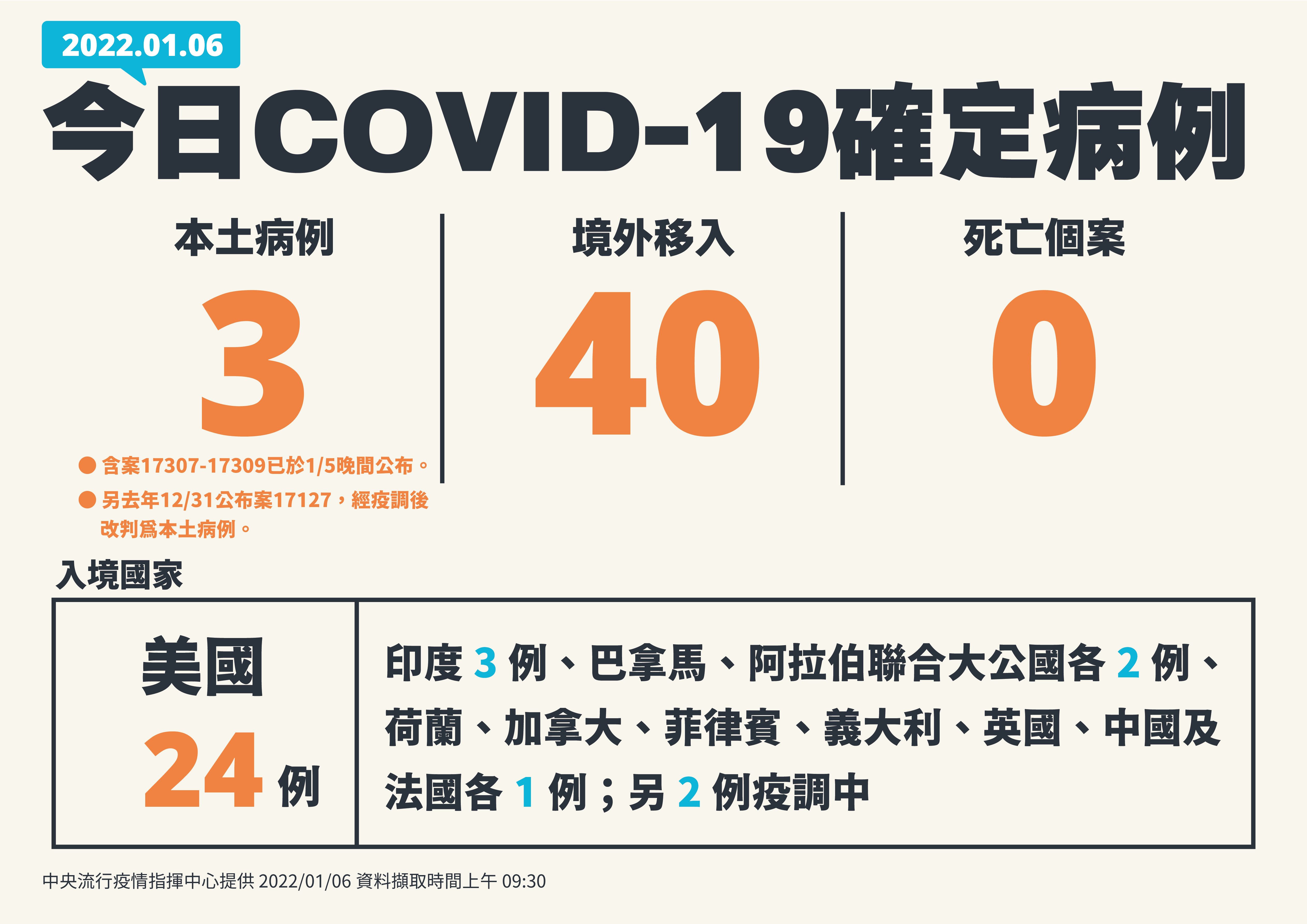 指揮中心表示,新增40例境外移入個案,為20例男性、20例女性,年齡介於未滿5歲至70多歲,分別自美國(24例,案17267、案17270、案17273-17275、案17277-17282、案17284-17289、案17291-17292、案17300、案17302、案17304-17306)、印度(3例,案17290、案17296、案17303)、巴拿馬(2例,案17271-17272)、荷蘭(案17268)、阿拉伯聯合大公國(2例,案17283、案17301)、加拿大(案17269)、菲律賓(案17276)、義大利(案17293)、英國(案17295)、中國(案17298)及法國(案17299)入境,另有2例(案17294、案17297)調查中,入境日介於2021年12月26日至2022年1月5日。