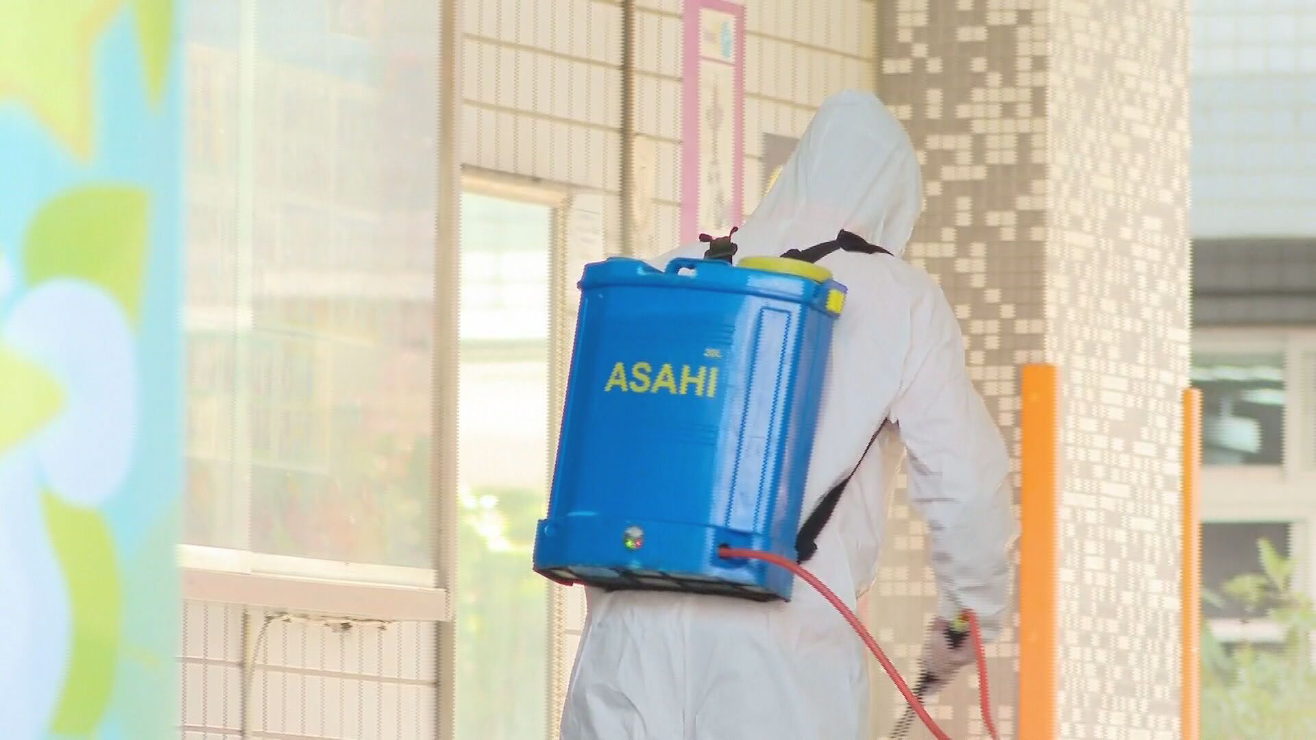工作人員揹著機器來回噴灑消毒藥水,桃園兩所國小10日緊急停課,全校大清消,就是因為機場群聚感染又擴大,中央流行疫情指揮中心指揮官陳時中表示:「醫院警覺性非常的高,他(幼童)去急診的時候,他事實上有做快篩,快篩是陰性,(但還是)再給他做了PCR就是陽性,(才)被判斷出來。」