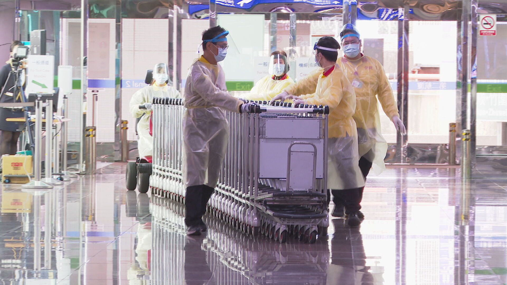 入境旅客左手推、右手拎,寧可大包小包卻沒人用推車。平常領行李,第一動作就是往推車上放,但如今旅客怕手推車,工作人員更怕,因為同事已經四人染疫。