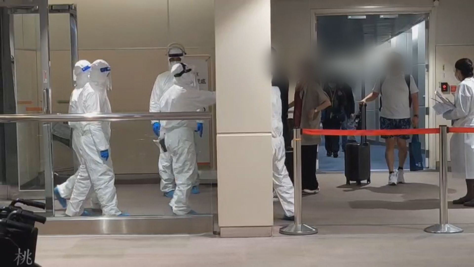 抵台班機緩緩降落,機場內部醫護人員穿戴防護衣,進駐候機室採檢,從11日開始,入境防疫新政策,所有長程航班旅客入境,都要馬上做PCR採檢。