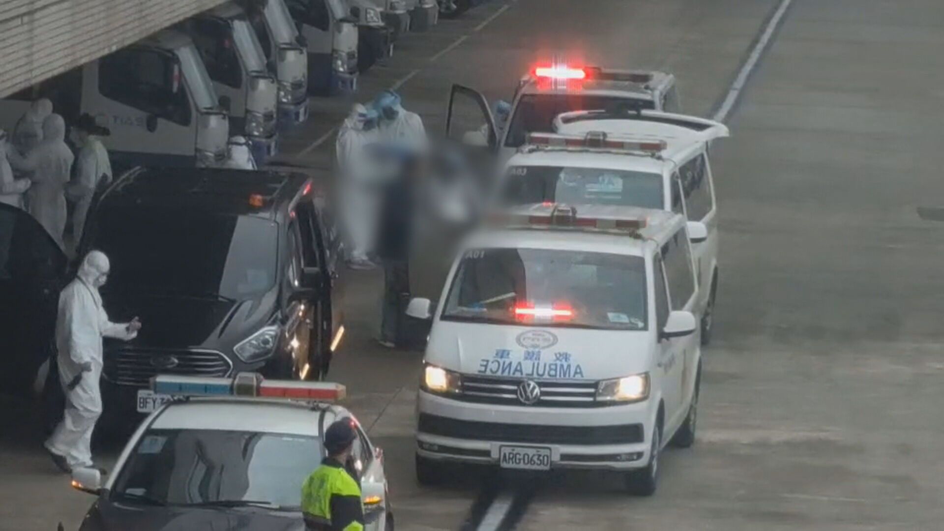 雙手消毒,鞋底也不放過,長程航班旅客入境得在候機室PCR陰性才能離開,但如果被驗出確診。候機室民眾:「準備好一台(救護車)就帶一個下去。」才一個被帶到旁邊,沒多久又多新同伴,直接走空橋下停機坪,搭救護車送醫。