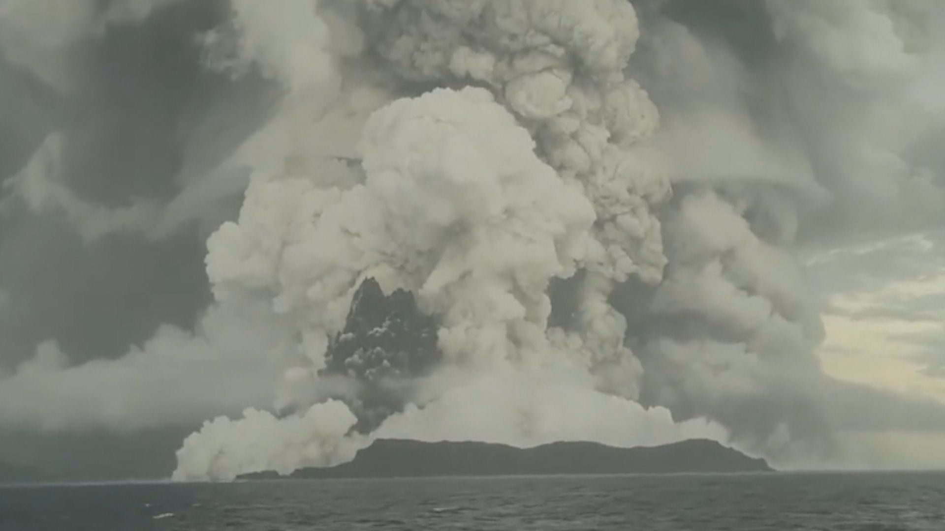 火山灰的煙霧不斷擴散,直吞整個東加島嶼上空,東加海底火山14日連續兩天噴發,海上拍攝的視角怵目驚心,從衛星畫面更清楚可見,火山造成的蕈狀雲