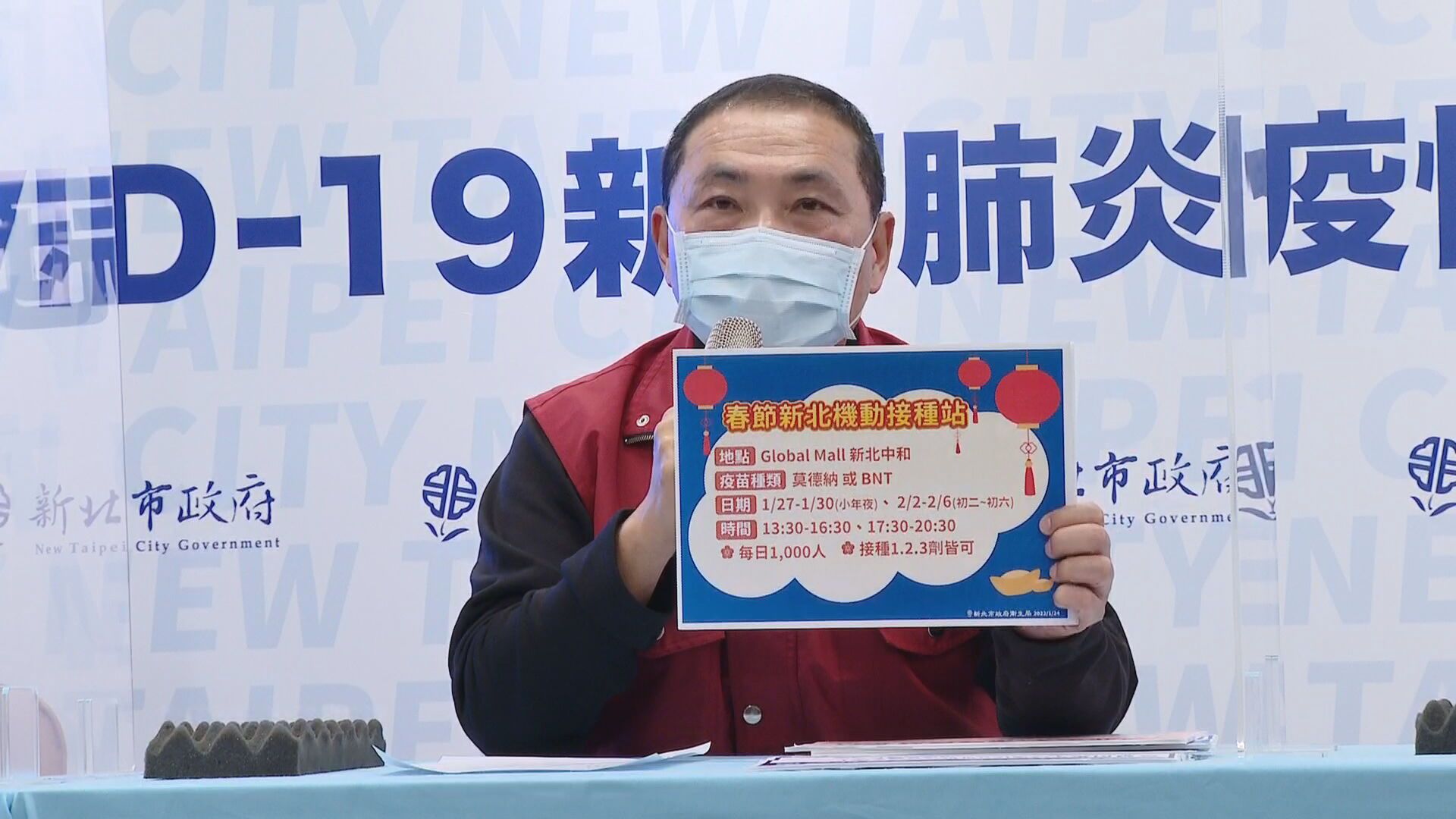 中央流行疫情中心拍板春節維持二級警戒,侯友宜稍早在新北市防疫記者會說明,將於中和區加設機動接種站,地點就在中和環球,且初三後就會有診所陸續加入,施打的主要為莫德納與BNT。