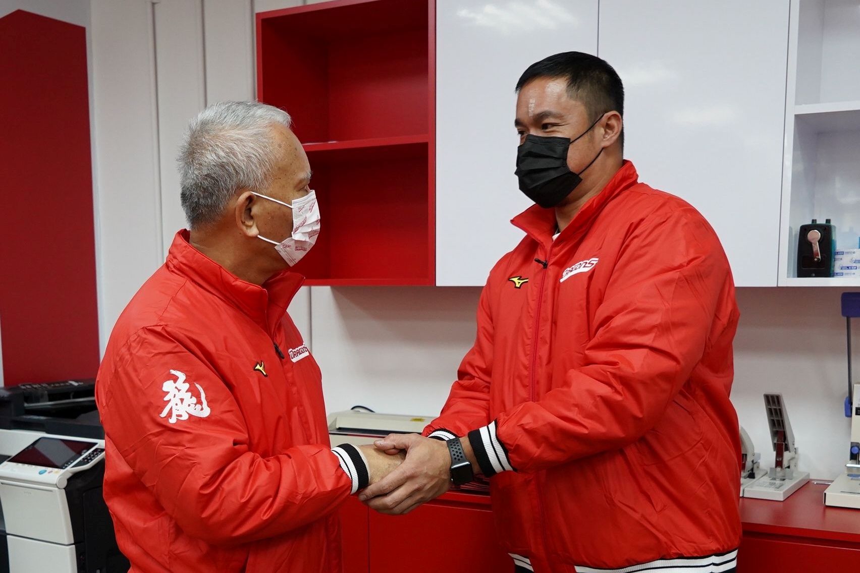 魏應充(左)在球團辦公室巧遇剛與味全龍隊簽約完的「大師兄」林智勝(右)。(翻攝自味全龍Dragons FB)