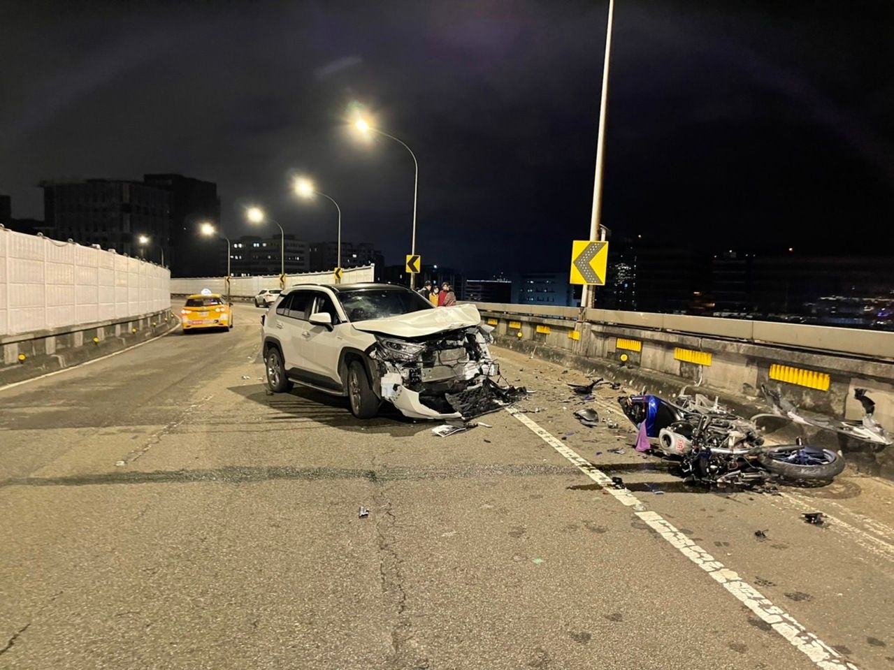 然而,伍女並未立即靠邊停車求助,透過行車紀錄器可見,她為了閃避來車,因此緊急打方向盤往左迴避,卻正面撞上由劉男駕駛的黃牌重機,導致劉男飛落高架橋,墜落約30公尺、10層樓高的地面,送醫後不治。