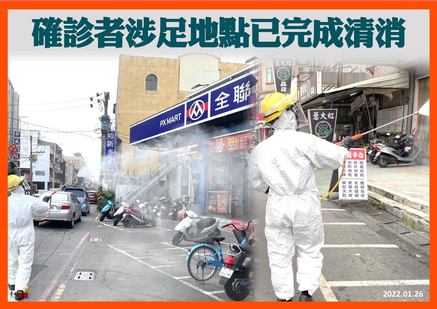 台南市衛生局說明,案18561曾於1月22日至24日間前往善化市場、新化區東林蝦仁飯、新化年貨大街、全聯善化中正店、安定區王家麵店、善化區胡厝里商店等地,相關涉足地點皆已完成清消。另,新北40多歲男性個案18612曾於1月22日、23日前往善化區,該案1月25日出現流鼻水、喉嚨痛等症狀,於26日確診。