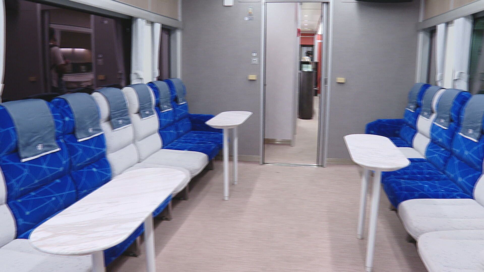 車廂寬敞明亮,兩種顏色的座位代表兩種不同風格,藍色是海洋,白色是大理石,隨著火車穿山越嶺看風景,是另一種旅遊人生的體驗。