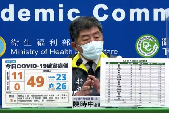 指揮中心表示,12日新增本土個案為4例男性、7例女性,年齡介於未滿5歲至60多歲;新增境外移入個案為27例男性、22例女性,年齡介於未滿5歲至60多歲,分別美國(9例)、加拿大(8例)、阿拉伯聯合大公國及英國(各2例)、香港、哈薩克、荷蘭、吉爾吉斯、德國、印尼、瑞士、緬甸、中國及立陶宛(各1例)移入;另18例調查中。入境日介於今(2022)年1月21日至2月11日。