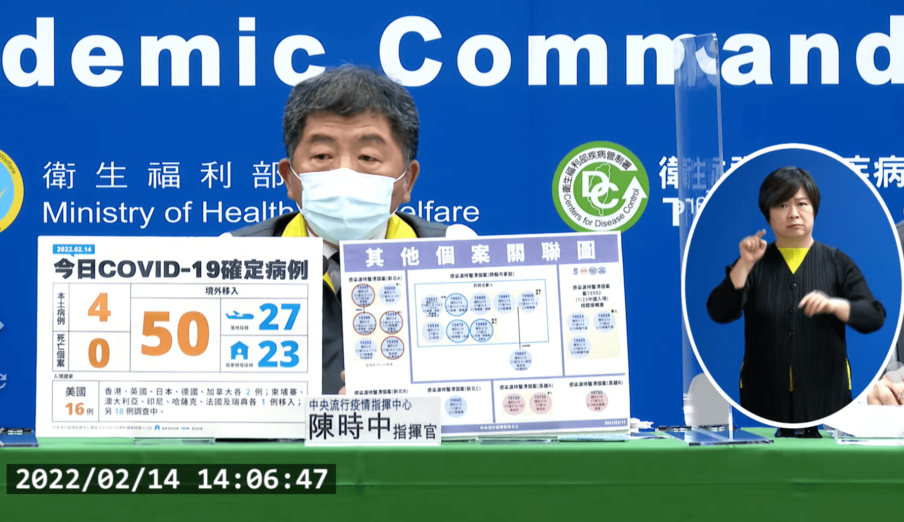 指揮中心表示,14日新增本土個案為2例男性、2例女性,年齡介於20多歲至50多歲。其中有3例在高雄、1例在苗栗。陳時中指出,苗栗確診病患同住3名家人採檢陰性,感染源可能跟高雄砂石場案有關,案19643跟案19622曾返回苗栗過年,足跡有相關但沒重疊,仍要了解相關細節。