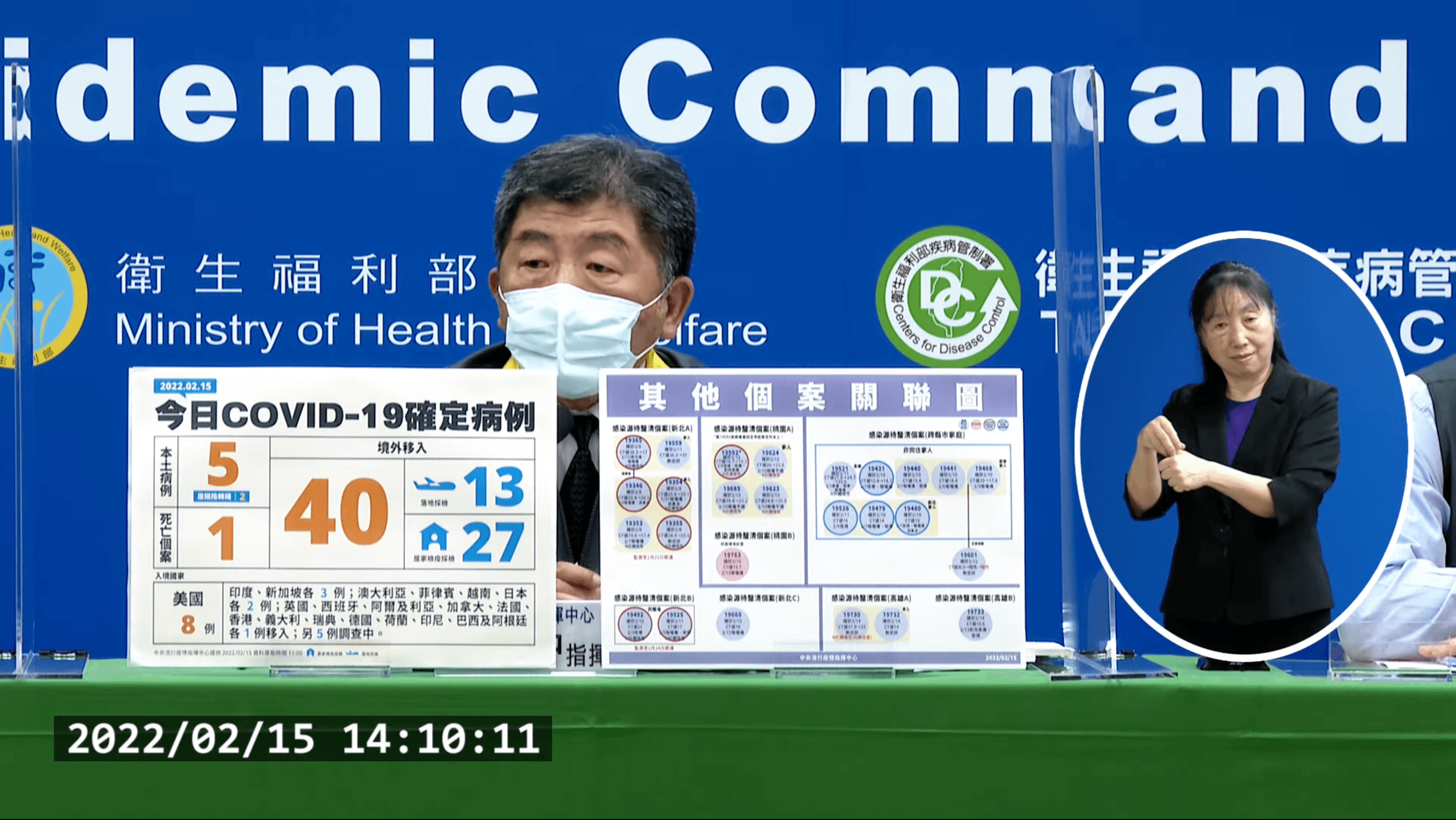 中央流行疫情指揮中心15日公布國內新增45例COVID-19確定病例,分別為5例本土個案及40例境外移入(13例為航班落地採檢陽性);另確診個案中新增1例死亡,為金嗓歌友會衍伸個案,是本土Omicron疫情首例死亡。