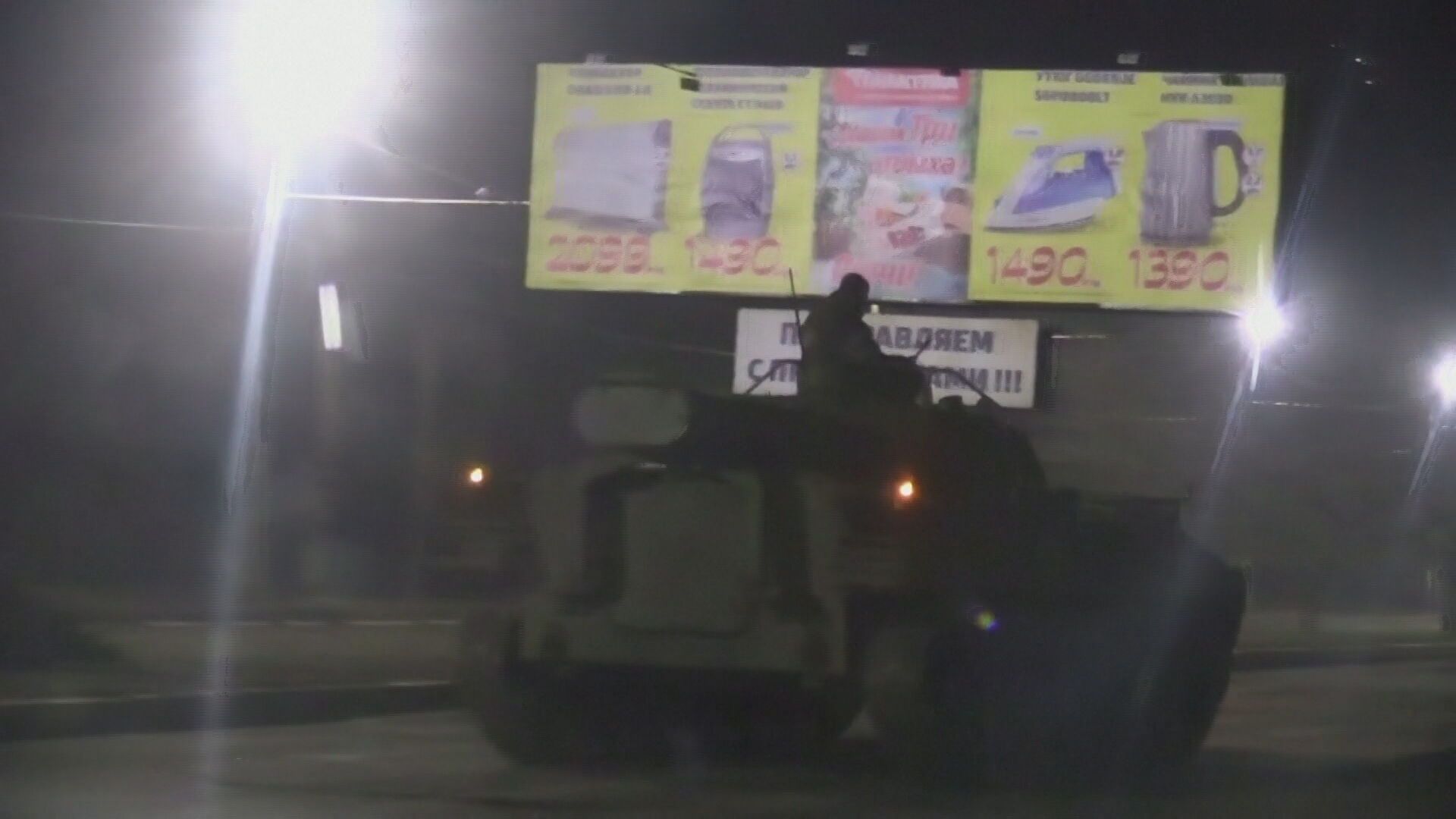 坦克、軍用車輛一台接著一台呼嘯而過,連夜開往烏東親俄地區頓內次克,寧靜的夜裡充滿著不祥之氣,烏東前線一夕變天,有的車輛還拉著大砲,這些坦克上雖然沒有任何部隊標記,但明顯和這件事有關。