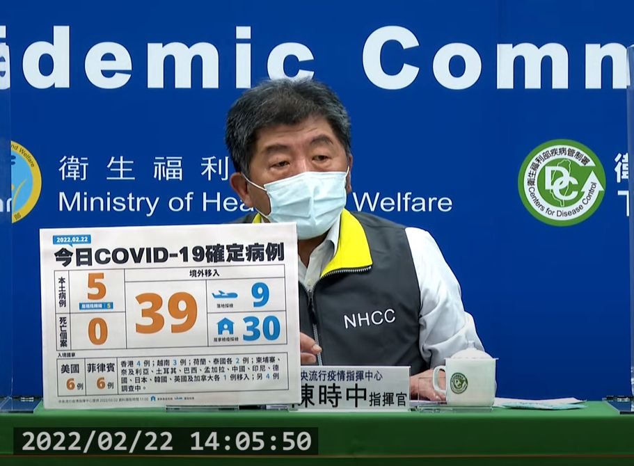 中央流行疫情指揮中心22日公布國內新增44例COVID-19確定病例,分別為5例本土個案皆為隔離期間陰轉陽個案,以及39例境外移入,當中9例為航班落地採檢陽性;另確診個案無新增死亡。指揮官陳時中表示,本土案例都是「陰轉陽」,對社會影響低。