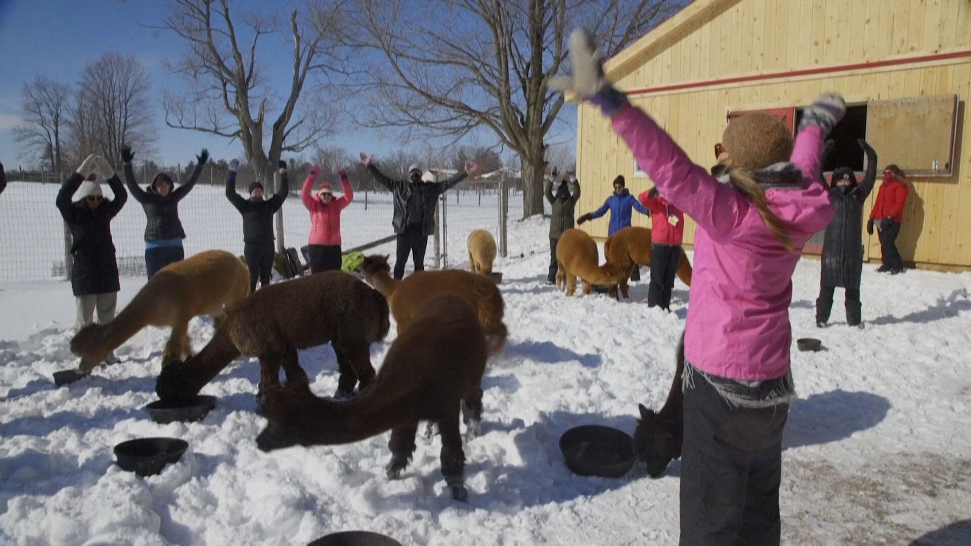 寒風呼呼吹過,加拿大安大略省普斯林治居民,頂著零下低溫,來一場雪地瑜珈,全身動起來。儘管穿著厚衣、戴著毛帽,動作卻毫不含糊,更有趣的,他們竟然圍著一群駱馬做運動,旁邊還有鴨子走來走去,現場相當熱鬧,但駱馬大爺們忙著吃草,根本沒空理會人類。