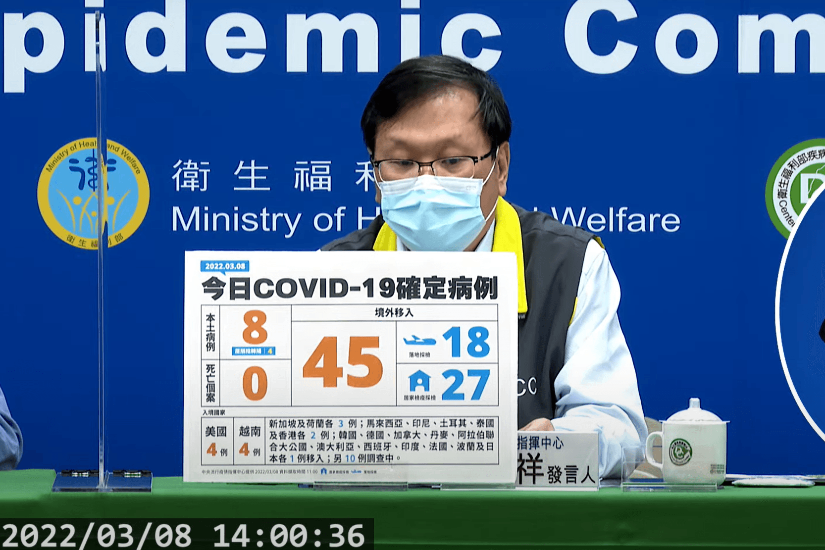 指揮中心說明,今日新增境外移入個案為30例男性、15例女性,年齡介於未滿5歲至60多歲,分別自美國及越南(各4例)、新加坡及荷蘭(各3例)、馬來西亞、印尼、土耳其、泰國及香港(各2例)、韓國、德國、加拿大、丹麥、阿拉伯聯合大公國、澳大利亞、西班牙、印度、法國、波蘭及日本(各1例)移入,另10例調查中。入境日介於今年1月21日至3月7日。