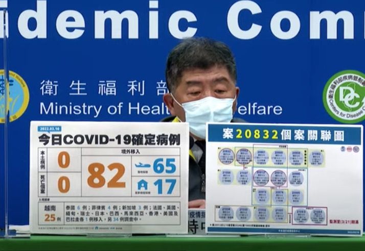 指揮中心說明,今日新增境外移入個案為44例男性、38例女性,年齡介於未滿5歲至70多歲,分別自越南(25例)、泰國(6例)、菲律賓(4例)、新加坡(3例)、法國、英國、緬甸、瑞士、日本、巴西、馬來西亞、香港、美國及巴拉圭(各1例)移入,另34例調查中。入境日介於今(2022)年2月22日至3月9日。