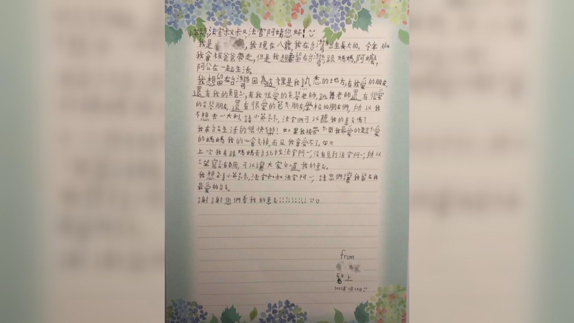 隨著法院裁定的交付日期將至,女童的親筆信也曝光,稚嫩的文字寫下,「我在台灣生活很快樂,如果被帶離開我最愛的、超級愛的媽媽,我的心會碎掉,而且我會受不了」,引發各界關注。不過藍男透過委任律師反控,是詹女利用媒體造成輿論壓力,認為一名8歲小孩怎會主動寫信給總統求助,質疑背後的動機與可信度。
