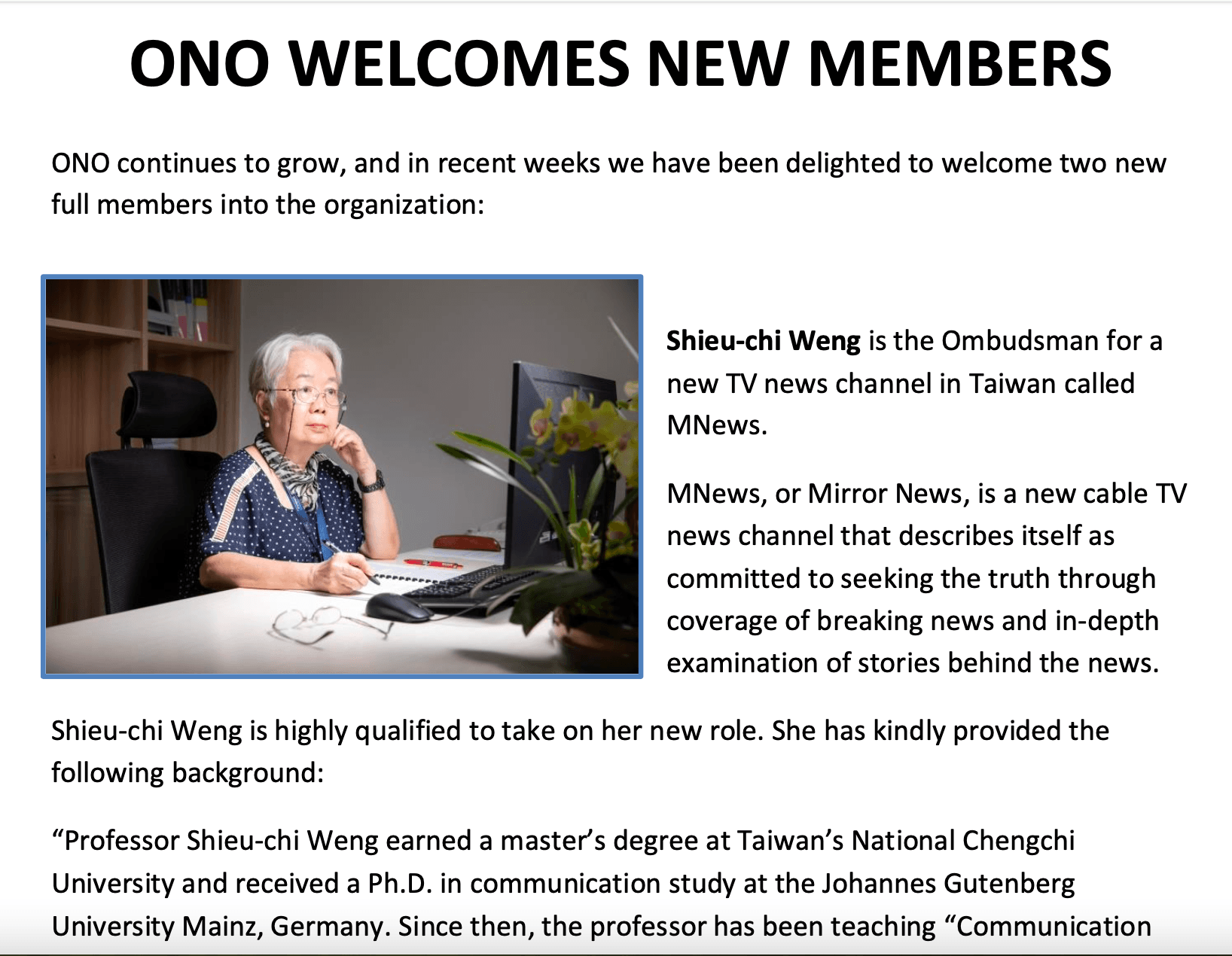 鏡電視外部公評人翁秀琪成為國際公評人組織(Organization of News Ombudsmen,簡稱ONO)的正式成員,也是目前為止台灣的第一人。ONO目前計有23國共66位公評人參與。美國公共電視《PBS》,英國《衛報》《BBC》,和美聯社AP的公評人都是這個組織的成員。亞洲則只有日本《朝日新聞》和印度《印度人報》(The Hindu)。