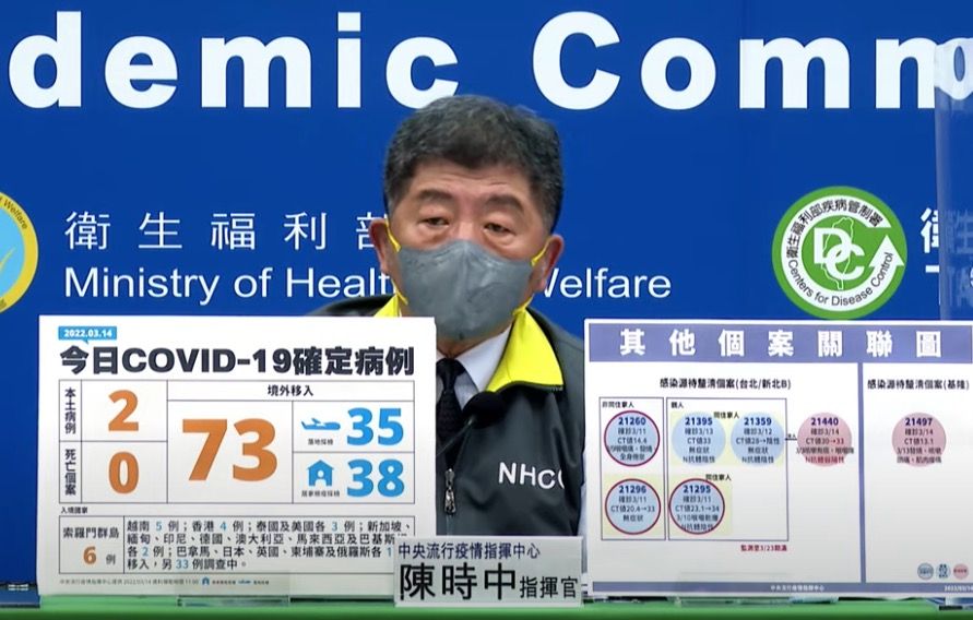 指揮中心說明,14日新增境外移入個案為42例男性、30例女性、1例調查中,年齡介於未滿10歲至80多歲,分別自索羅門群島(6例)、越南(5例)、香港(4例)、泰國及美國(各3例)、新加坡、緬甸、印尼、德國、澳大利亞、馬來西亞及巴基斯坦(各2例)、巴拿馬、日本、英國、柬埔寨及俄羅斯(各1例)移入,另33例調查中。入境日介於今(2022)年2月27日至3月13日。