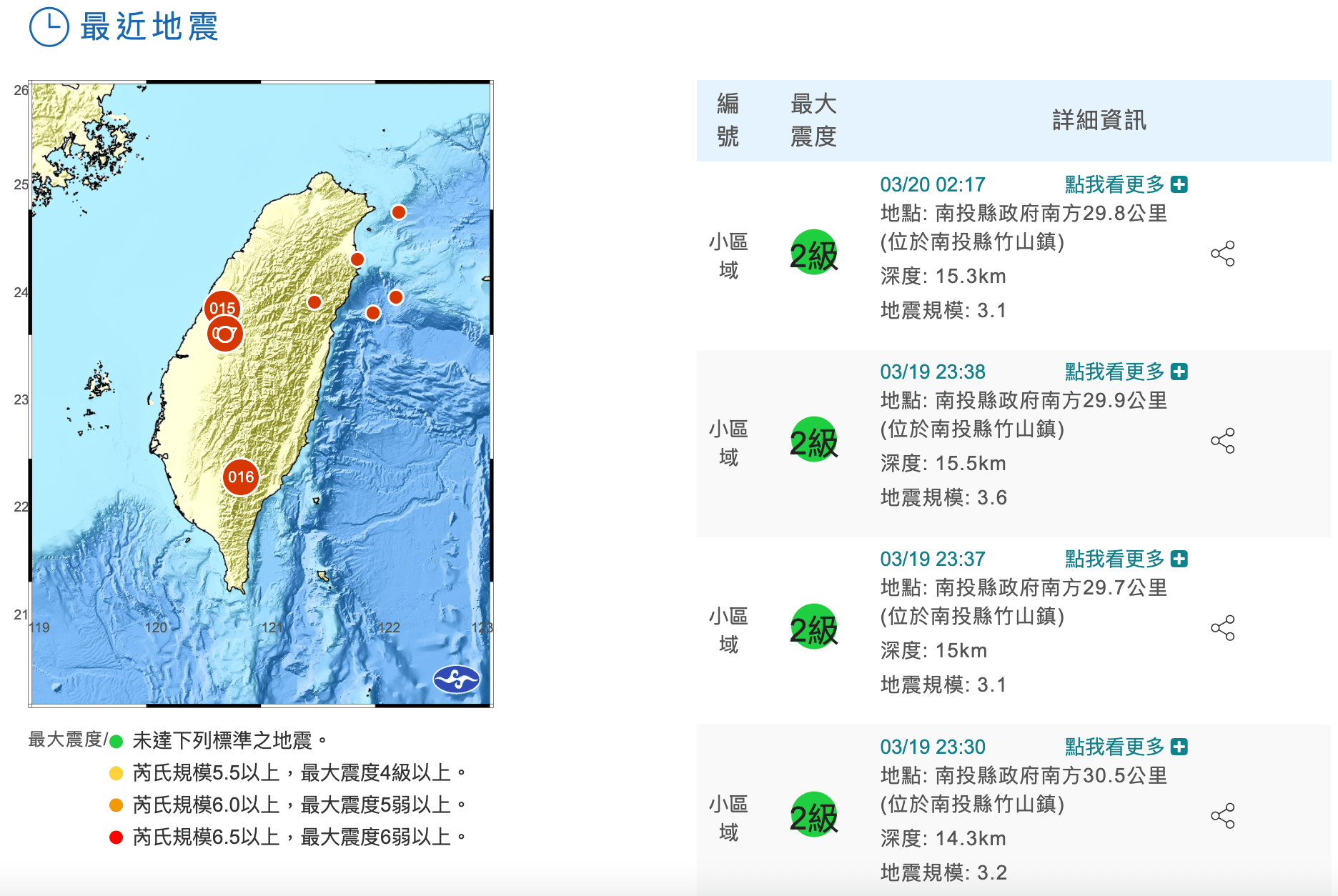 氣象局地震測報中心觀測,從19日晚間8點52分、9點59分的兩個前震、11點23分的規模5.1主震,至20日凌晨2點17分,已經觀測到7起地震,前震、餘震規模介於3.1至3.6之間,最大震度2級。