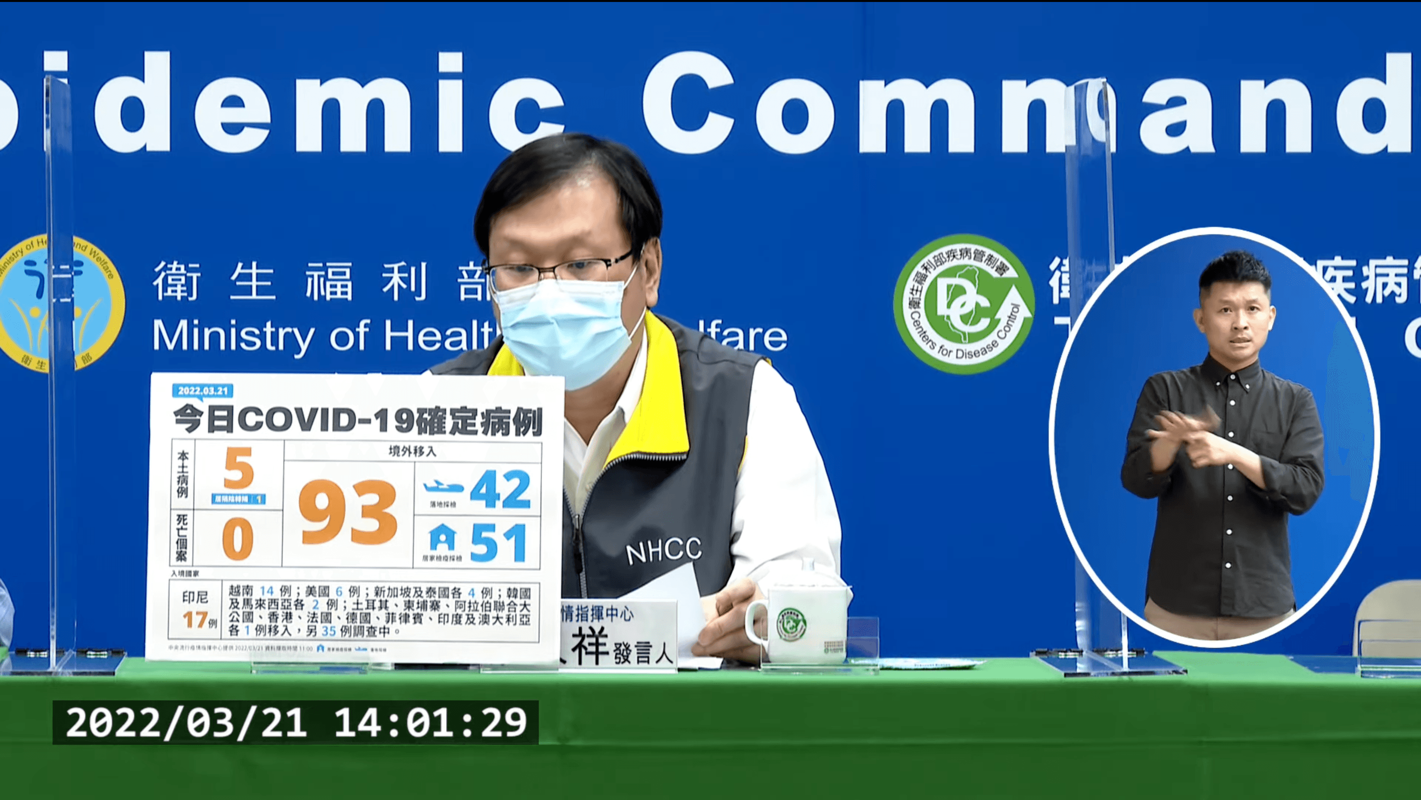 指揮中心說明,21日新增境外移入個案為50例男性、43例女性,年齡介於未滿5歲至80多歲,分別自印尼(17例)、越南(14例)、美國(6例)、新加坡及泰國(各4例)、韓國及馬來西亞(各2例)、土耳其、柬埔寨、阿拉伯聯合大公國、香港、法國、德國、菲律賓、印度及澳大利亞(各1例)移入,另35例調查中。入境日介於2022年3月5日至3月20日。