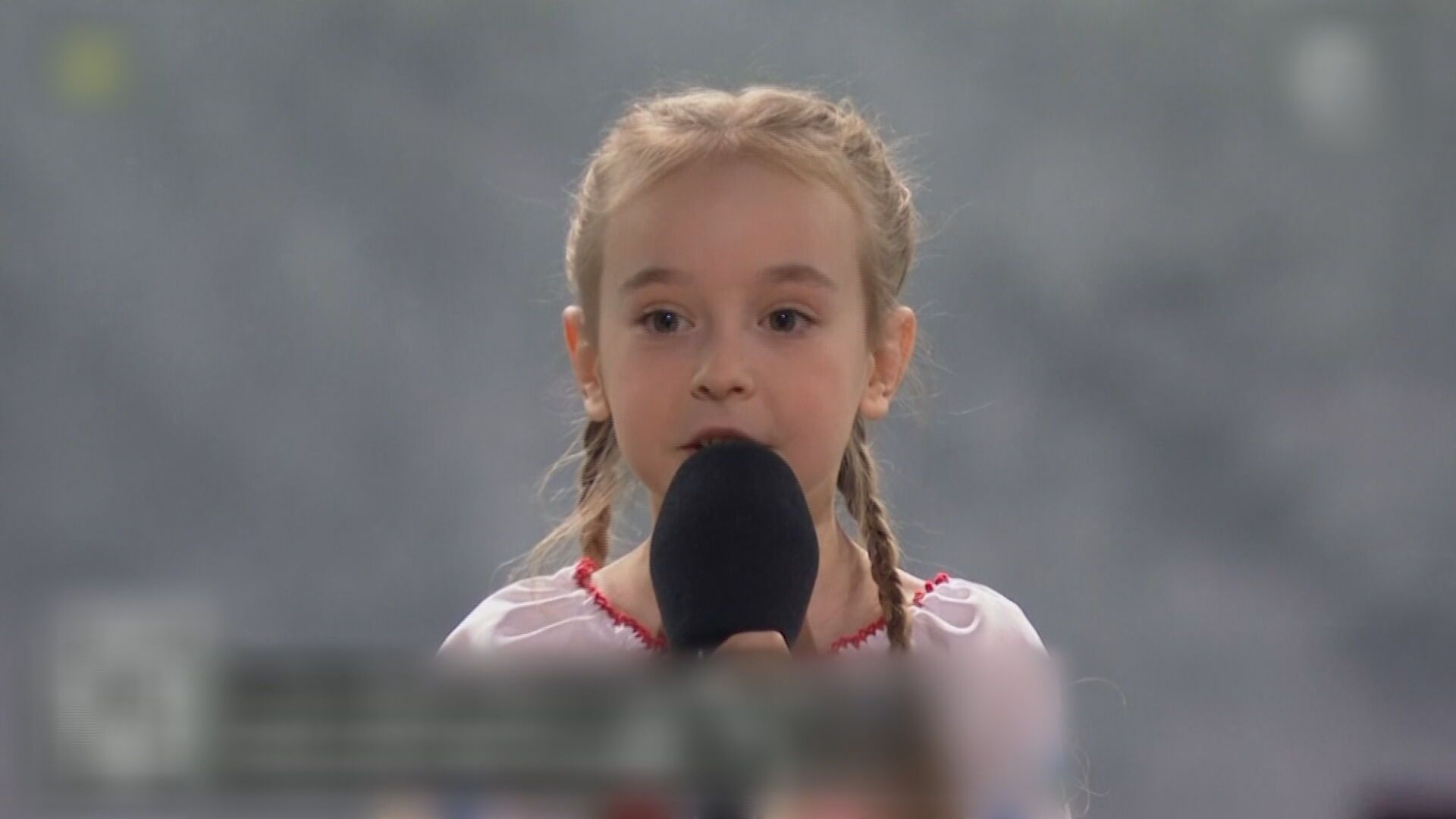穿著傳統繡花服飾,烏克蘭7歲女童在波蘭慈善音樂會高唱烏克蘭國歌。烏克蘭7歲女童艾蜜莉亞:「吾等烏克蘭同胞,青天之上,命運將再展笑顏。」