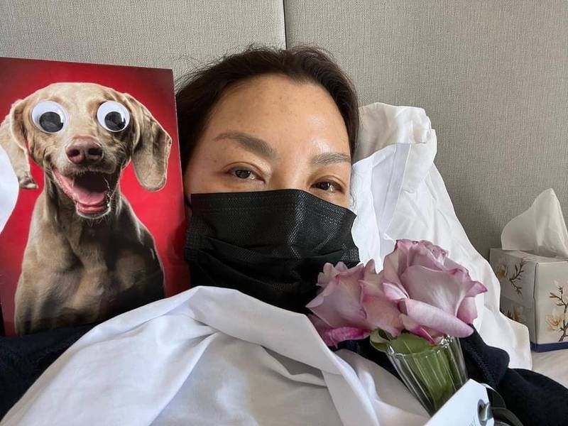 楊紫瓊透過臉書自曝確診,還放上自己戴著黑色口罩,虛弱地躺在床上的自拍照,入鏡的還有衛生紙、裝在花瓶裡的一束玫瑰花,以及貼著誇張豆豆眼睛的狗狗畫像,呼應《媽的多重宇宙》(Everything Everywhere All at Once)的視覺設計。