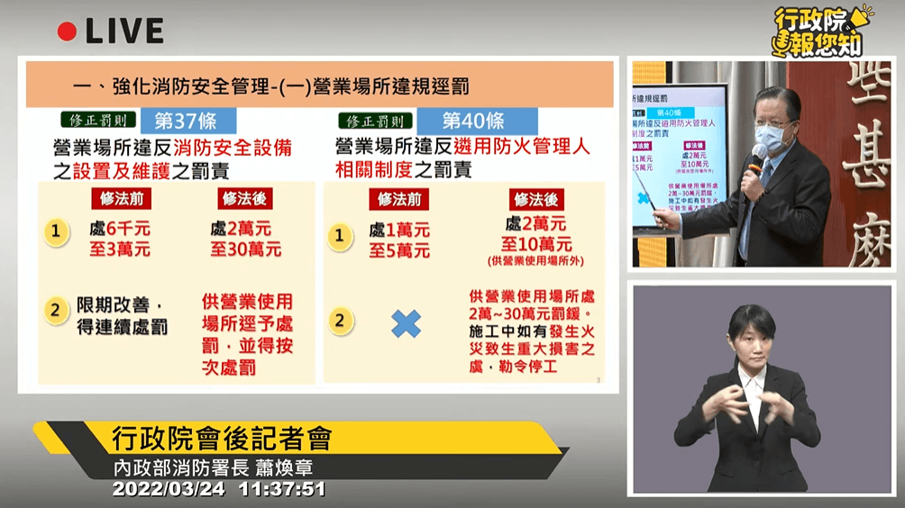 行政院會24日通過內政部擬具的《消防法》部分條文修正草案,將函請立法院審議。內政部消防署長蕭煥章出席行政院會後記者會,報告修正草案議題,他提到為強化營業場所負責人責任,未來只要發現消防安全設備有缺失,就會直接開罰30萬元,不像以前會再給改善時間。