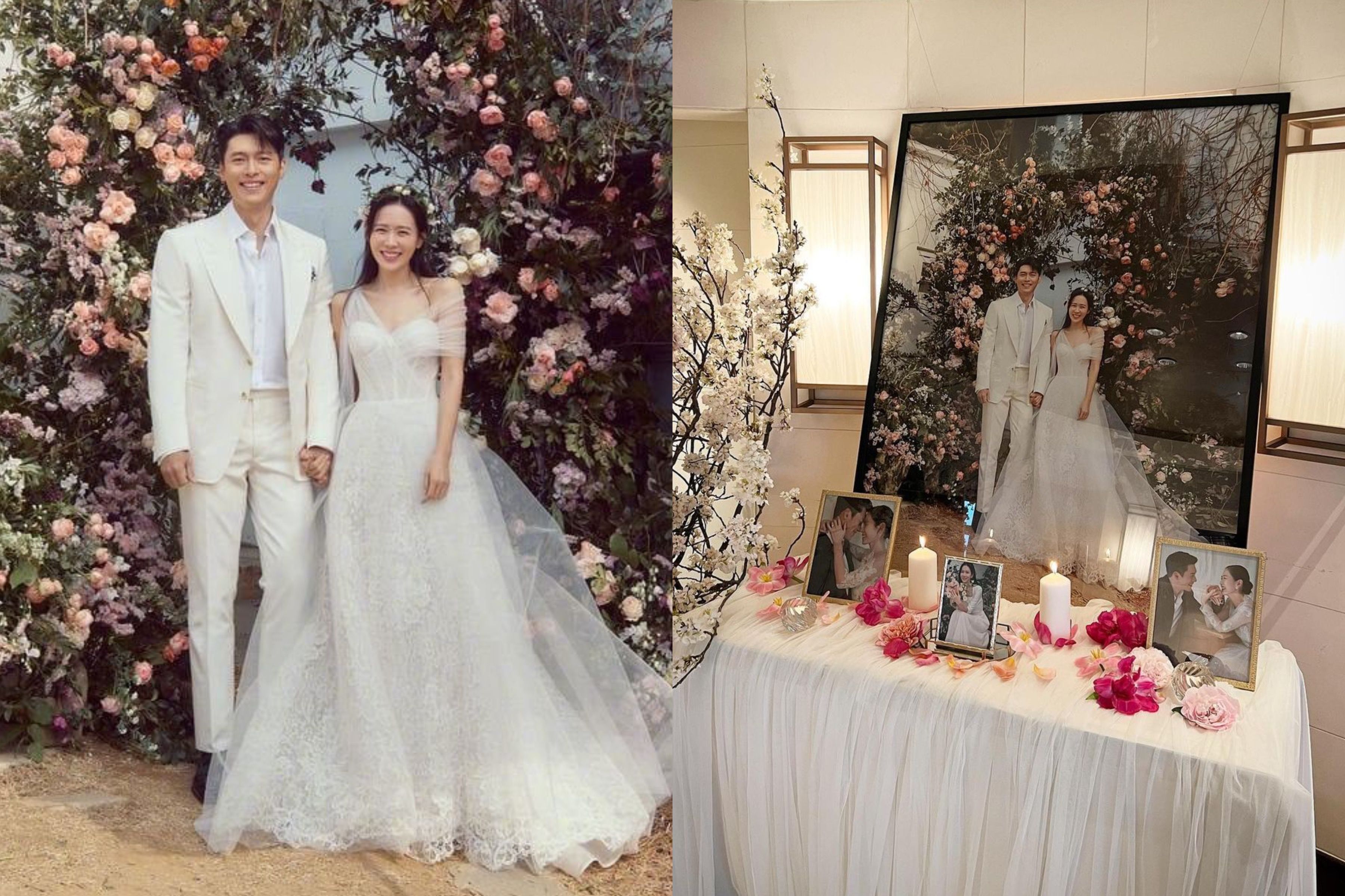 在崔星俊公布的畫面可見,大型婚紗照前方有一張白紗布、白蠟燭裝飾的婚禮照片桌,並搭配鮮花、花瓣裝點;在左方照片上,長髮盤起的孫藝真穿著透膚長紗,與老公玄彬甜蜜頭碰頭,中間放的是孫藝真個人婚紗照,右方照片是兩人緊握雙手,相視而笑。