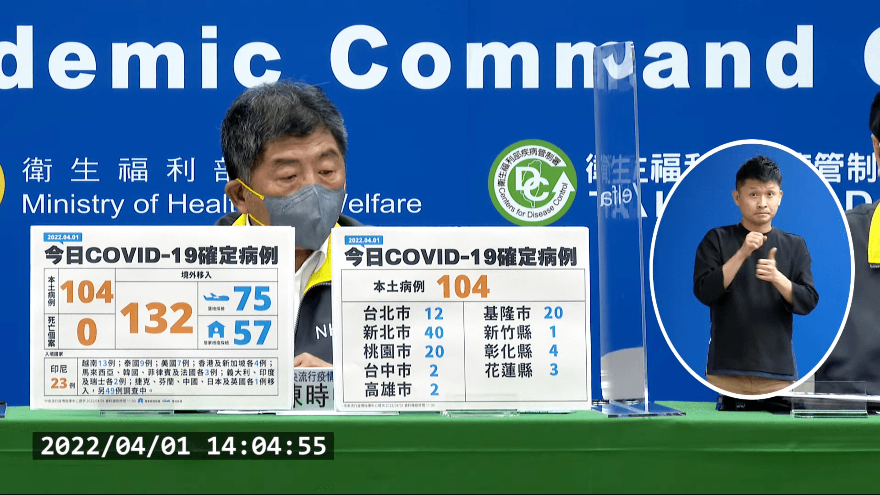 指揮中心說明,境外移入個案為71例男性、59例女性、2例調查中,年齡介於未滿5歲至70多歲,分別自印尼23例、越南13例、泰國9例、美國7例、香港及新加坡各4例、馬來西亞、韓國、菲律賓及法國各3例、義大利、印度及瑞士各2例、捷克、芬蘭、中國、日本及英國各1例移入,另49例調查中。入境日介於2022年2月22日至3月31日。