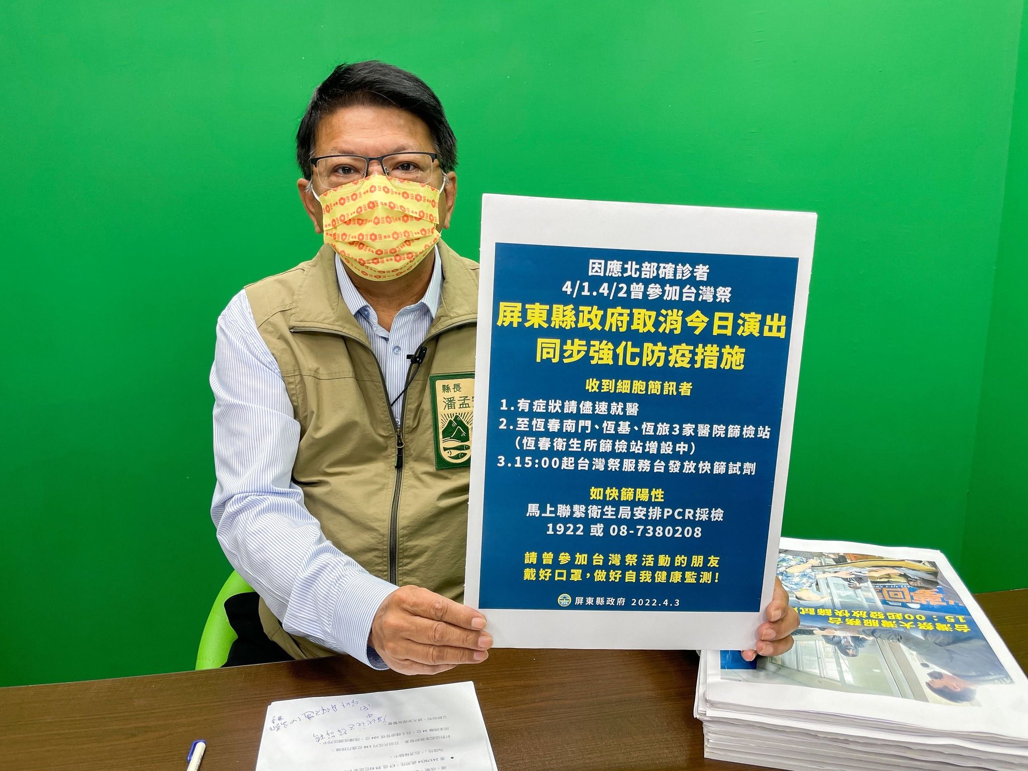 在墾丁舉辦的「台灣祭」吸引3萬人參與,原預計4月1日至3日舉行,不過主辦單位2日晚間接獲通知,一名從北部南下參加活動的民眾確診COVID-19,活動緊急取消活動。屏東縣長潘孟安4日表示,全縣設6座篩檢站,並持續發放快篩試劑,擴大篩檢,強化防疫。