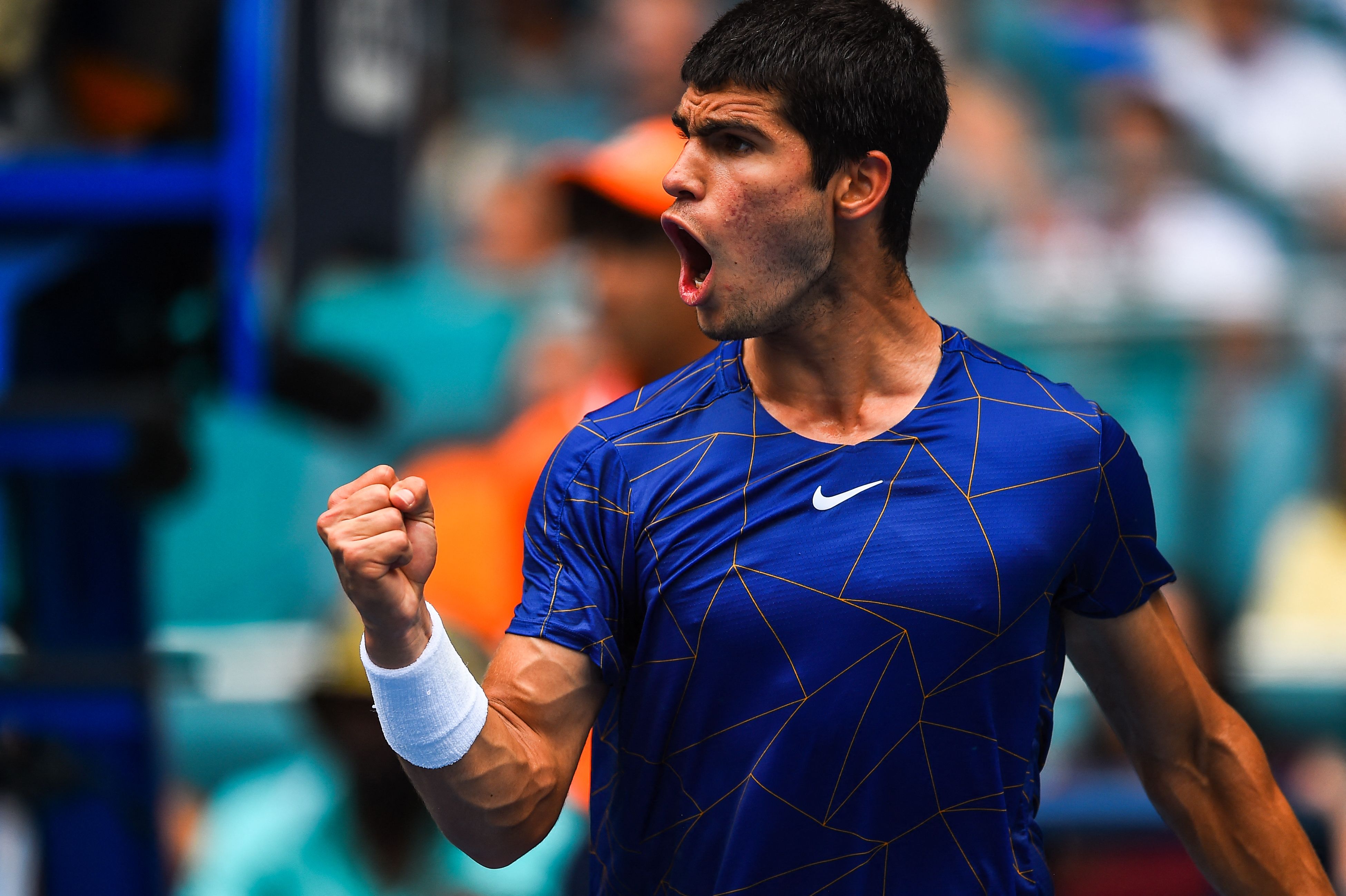 「邁阿密網球大師賽」決賽,西班牙18歲小將Carlos Alcaraz,首盤從3:0劣勢,一路追到5:5,第11局再度破發,以7:5搶下首盤。第二盤首局,Alcaraz左右調動,讓Rudd滿場飛奔,Rudd網前救球,Alcaraz順勢調高球,成功破發,Alcaraz第三局,趁勝追擊,跑動中,正手拍回擊。