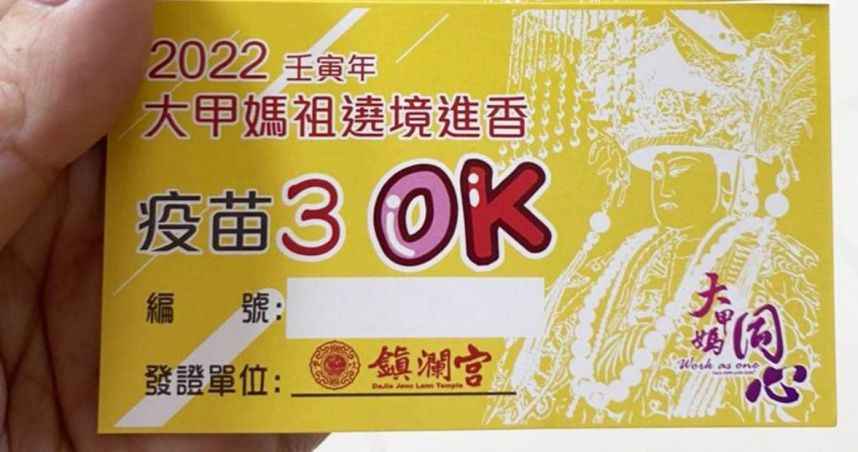 台中大甲鎮瀾宮遶境是一年一度大事,近日因本土疫情升溫,為配合防疫措施與識別,鎮瀾宮自4月2日起至4月5日,上午9點至晚上8點,在大甲農會順天辦事處,開放信眾出示疫苗小黃卡正本、身分證件正本,至檢錄服務處造冊登錄,就能領取「疫苗3OK」卡。