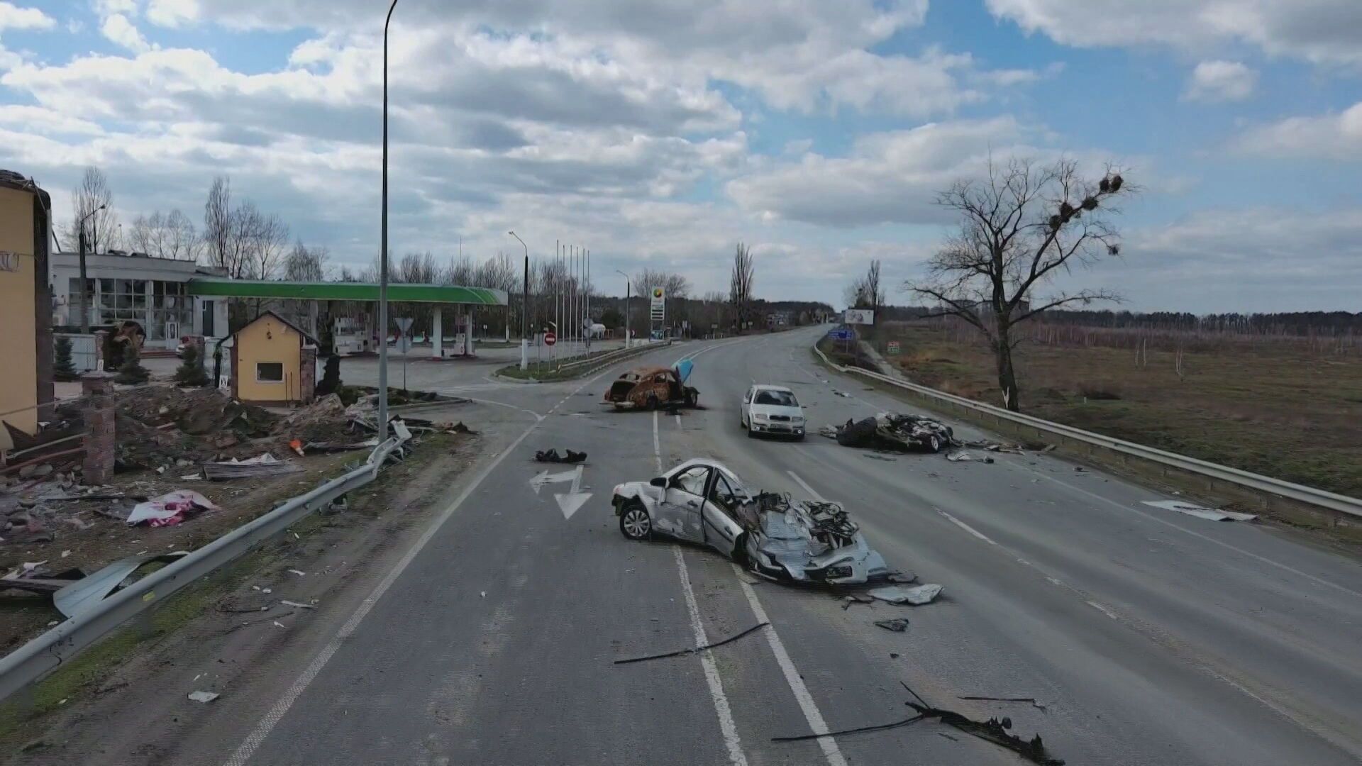 俄羅斯軍隊的暴行持續曝光,《紐約時報》特別查證一段2月底的空拍影片,俄軍坦克車隊在布查大街瞄準一名自行車騎士開火,《紐約時報》同時也查證了另外一段烏克蘭軍處決俄羅斯士兵的影片,這時俄軍一邊撤出烏克蘭首都基輔外,一邊血洗其他城市,包含空襲轟炸烏克蘭各地油庫。現在連英國首相強森看到俄軍殺害平民的暴行,態度都轉彎,表示俄軍和種族滅絕相差無幾。
