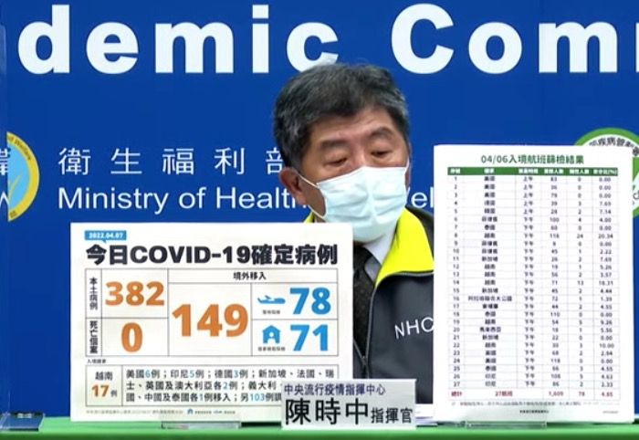 指揮中心表示,今日新增之382例本土病例,為188例男性、194例女性,年齡介於未滿5歲至80多歲,發病日介於今(2022)年3月29日至4月7日,其中包含165例為無症狀感染。個案分佈為新北市(111例)、臺北市(87例)、高雄市(59例)、基隆市(41例)、桃園市(28例)、花蓮縣(16例)、嘉義縣(8例)、新竹縣(7例)、臺南市及屏東縣(各5例)、臺中市(4例)、新竹市(3例)、金門縣、宜蘭縣及雲林縣(各2例)、苗栗縣及彰化縣(各1例)。相關疫情調查持續進行中。