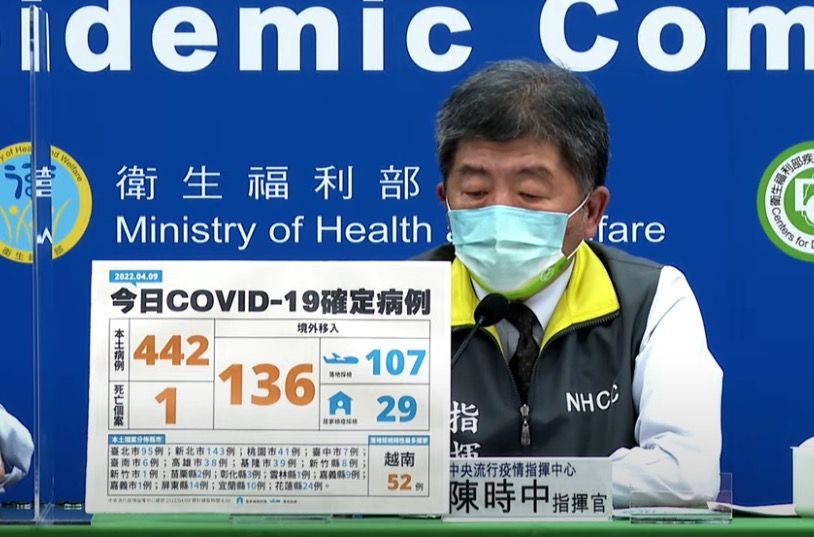 指揮中心表示,今日新增之442例本土病例,為230例男性、212例女性,年齡介於未滿5歲至80多歲,發病日介於今(2022)年2月1日至4月9日,其中包含250例為無症狀感染。個案分佈為新北市(143例),臺北市(95例),桃園市(41例),基隆市(39例),高雄市(38例),花蓮縣(24例),屏東縣(14例),宜蘭縣(10例),嘉義縣(9例),新竹縣(8例),臺中市(7例),臺南市(6例),彰化縣(3例),苗栗縣(2例),新竹市、雲林縣及嘉義市(各1例)。相關疫情調查持續進行中。
