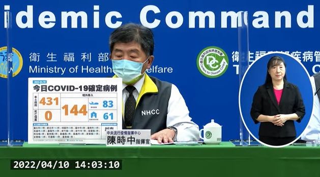 指揮中心表示,今日新增之431例本土病例,為209例男性、219例女性、3例調查中,年齡介於未滿5歲至80多歲,發病日介於今(2022)年3月30日至4月10日,其中包含237為無症狀感染。個案分佈為新北市(143例)、臺北市(67例)、桃園市(45例)、屏東縣(31例)、基隆市(28例)、高雄市(26例)、臺南市(20例)、宜蘭縣(14例)、新竹縣及花蓮縣(各13例)、臺中市(8例)、新竹市(7例)、嘉義市(6例)、雲林縣(3例)、苗栗縣、南投縣及嘉義縣(各2例)、臺東縣(1例)。相關疫情調查持續進行中。